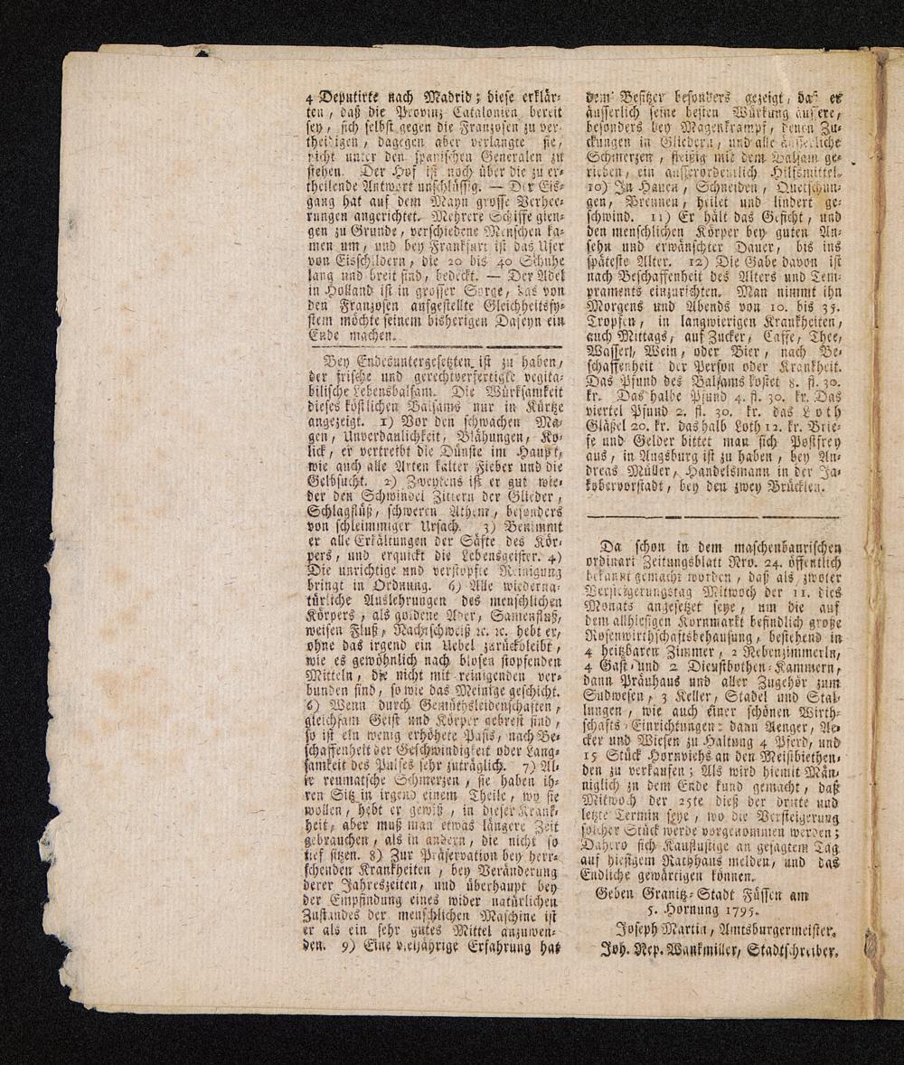 Monats angefeget fege, um Die aufdem alldiefigen SKornniarkt befindlich großeojenwirthichaftstehaufung„ befichend in4 heißbaren Zimmer, 2 Rebensimmerla,4+ Orfiind 2 Dieufibothen: Kammern,dann Präuhaus und aller Zugehör zumSudwefen, 3 Keller, Stadel und Stalungen, wie auch einer fhönen Wirth:fehafts» Einrichtungen: dann Henger, Meer und Wiefen zu Haltung 4 Brerd, und15 Stüf Hornviche an den Meijibierhensden zu verkaufen; US mird hiemit Miniglich zn dem Erde Fund gemacht, dafMimoh der 25te.dieh der dritte undlegte Termin eye, 100 die Berfleigerungfeicher Stück werde vorgenommen werden;Dapıro fih- Raufufige an gefagtem Tag,auf Hifigem Narhhaus melden, und dasEndiihe gemwärtigen Fönnen,Geben Granig- Stadt Füffen am5. Hornung 1795.Fofeph Martin, Amtsburgerineifter,