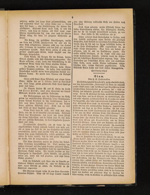 Von der Hauptstadt Bangkok (im Süden), die wie eine„Sonne strahlt", führt eine Wasserstraße des NiescnstromesMenain in einer Breite von 300 bis über 400 Meter fünf-hundert Stunden — an 2000 Kilometer längs!) — vonSüd gen Nord durch das Reich bis hinauf in's „Zauberreichdes Urwaldes". Unterwegs — „immergrüne Wälder auf Bergen und Hügeln, durch welche nur der Elephant sich Bahn brechenkaun und in deren wilder Einsamkeit der Tiger als Jagdkönigherrscht"; dann unabsehbare Ebenen mit solch' fruchtbaren Neis-und Zuckerseldern, daß ihre Doppelernte keinen Mangeleintreten läßt; zahllose Thäler mit krhstallklaren Bächen undfischreichen Flüssen, von Palmhaincn, Tamarinden und Bananenbeschattet, in deren Zweigen Schaarcn von bunten Vögeln sichschaukeln, unter deren kühlem Laubdach eine Menge von Silber-kranichen, Reihern und Ibissen wohnt, indeß in der lauwarmenFluth das Krokodil mit glühendem Auge die Sprünge derAffen verfolgt, welche die Krokodile in gröblichster Weise necken»
