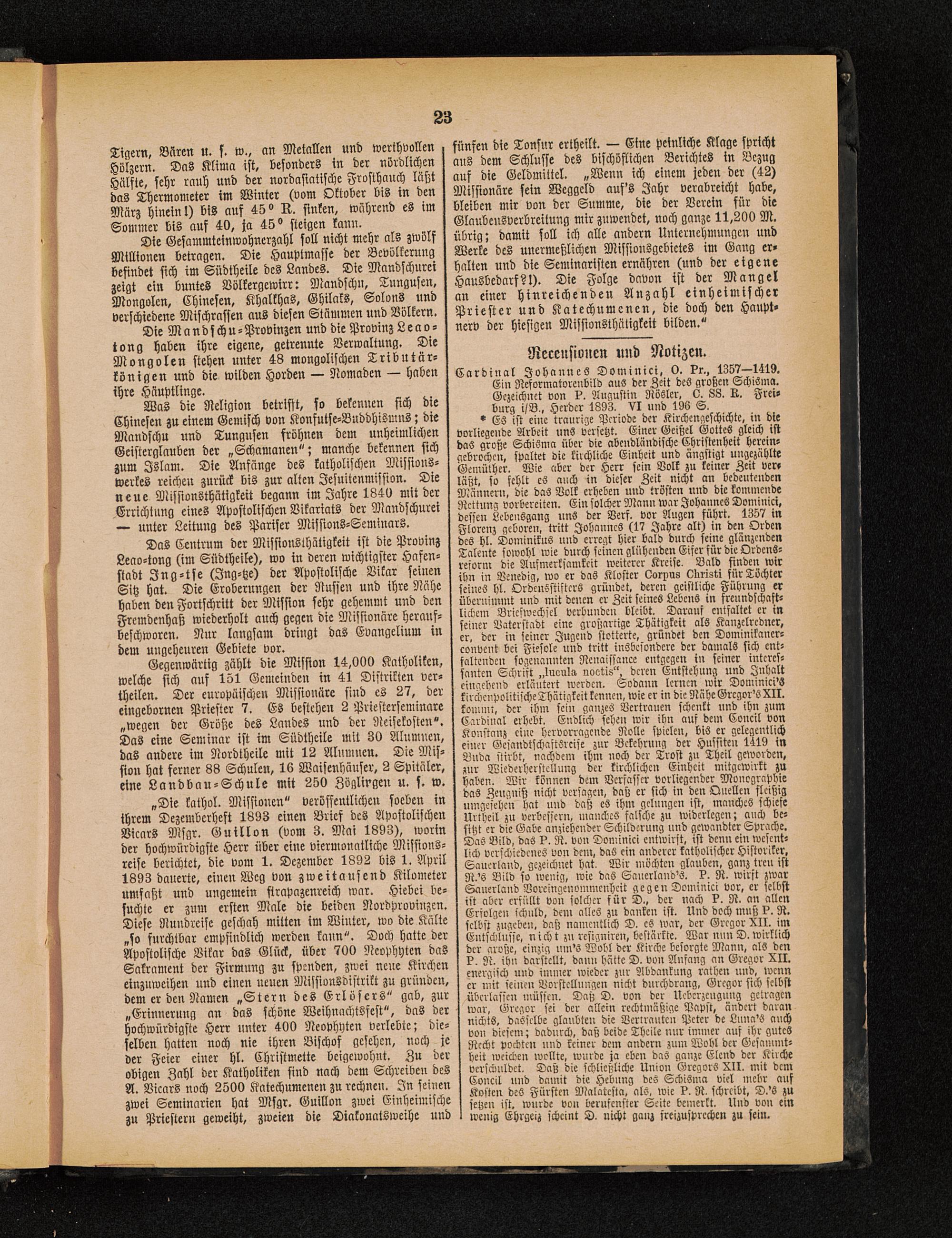 * Es ist eine traurige Periode der Kirchcngeschichte, in dievorliegende Arbeit uns versetzt. Einer Geißel GotteS gleich istdas große Schisma über die abendländische Christenheit herein-gebrochen, spaltet die kirchliche Einheit und ängstigt ungezählteGemüther. Wie aber der Herr sein Volk zu keiner Zeit ver-läßt, so fehlt es auch in dieser Zeit nicht an bedeutendenMännern, die das Volk erheben und trösten und die kommendeRettung vorbereiten. Ein solcher Mann war Johannes Dominici ,dessen Lebeiisgang uns der Vers. vor Augen führt. 1357 inFlorenz geboren, tritt Johannes (17 Jahre alt) in den Ordendes hl. Dominikus und erregt hier bald durch seine glänzendenTalente sowohl wie durch seinen glühenden Eifer für die Ordcns-reiorm die Aufmerksamkeit weiterer Kreise. Bald finden wirihn in Venedig, wo er das Kloster Oorpus Lüiristi für Töchterseines hl. Ordcnsstiftcrs gründet, deren geistliche Führung erübernimmt und mit denen er Zeit seines Lebens in frenndschaft-licbcm Briefwechsel verbunden bleibt. Darauf entfaltet er inseiner Vaterstadt eine großartige Thätigkeit als Kanzelrcdner,er, der in seiner Jugend stotterte, gründet den Dominikancr-conveut bei Fiesole und tritt insbesondere der damals sich ent-faltenden sogenannten Renaissance entgegen in seiner interes-santen Schrift „luenla noetüs", deren Entstehung und Inhalteingehend erläutert werden. Sodann lernen wir Dominici'Skirchcnpolitische Thätigkeit kennen, wie er in die Nähe Grcgor's XII.kommt, der ihm sein ganzes Vertrauen schenkt und ihn zumCardinal erhebt. Endlich sehen wir ihn aus dem Concil vonKonstanz eine hervorragende Roste spielen, biö er gelegentlicheiner GesandtschastSrcise zur Bekehrung der Hussiten 1419 inBuda stirbt, nachdem ihm noch der Trost zu Theil geworden,zur Wiederherstellung der kirchlichen Einheit mitgewirkt zuhaben. Wir können dem Verfasser vorliegender Monographiedas Zeugniß nicht versagen, daß er sich in den Quellen fleißigumgesehen hat und daß eS ihm gelungen ist, manches schiefeUrtheil zu verbessern, manches falsche zu widerlegen; auch be-sitzt er die Gabe anziehender Schilderung und gewandter Sprache.Das Bild, das k. R. von Dominici entwirft, ist denn ein wesent-lich verschiedenes von dem, das ein anderer katholischer Historiker,Sauerland , gezeichnet hat. Wir möchten glauben, ganz treu istR.'s Bild so wenig, wie das Sanerland'S. ?. N. wirft zwarSanerland Voreingenommenheit gegen Dominici vor, er selbstist aber erfüllt von solcher für D., der nach L. R. an allenErfolgen schuld, den« alles zu danken ist. Und doch muß I?. R.selbst zugeben, das; namentlich D. es war, der Gregor XII. imEntschlüsse, nicht zu rcsigniren, bestärkte. War nun D. wirklichder große, einzig uin's Wobl der Kirche besorgte Mann, als denI?. N. ihn darstellt, dann hätte D. von Anfang an Gregor XII. energisch und immer wieder zur Abdankung rathen und, wenner mit seinen Vorstellungen nicht durchdrang, Gregor sich selbstüberlassen müssen. Daß D. von der Ueberzeugung getragenwar, Gregor sei der allein rechtmäßige Papst, ändert darannichts, dasselbe glaubten die Vertrauten Peter de Luna's auchvon diesem; dadurch, daß beide Theile nur immer auf ihr gutesRecht pochten und keiner dem andern zum Wohl der Gcsammt-hest weichen wollte, wurde ja eben das ganze Elend der Kircheverschuldet. Daß die schlicßlichc Union Gregors XII . mit demConcil und damit die Hebung des Schisma viel mehr aufKosten deö Fürsten Malatesta, als, wie ?. R. schreibt, D.'S zusetzen ist. wurde von berufenster Seite bemerkt. Und von einwenig Ehrgeiz scheint D. nicht ganz freizusprechen zu sein.