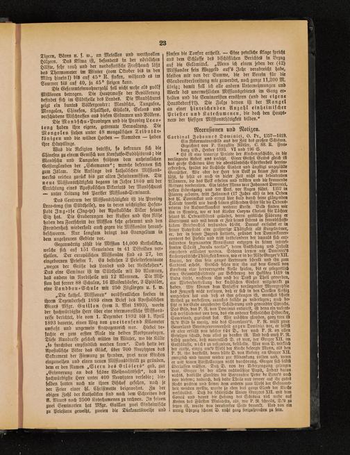 „Die kathol. Missionen" veröffentlichen soeben inihrem Dezemberheft 1893 einen Brief des ApostolischenVicars Msgr. Guillon (vom 3. Mai 1893), worinder hochwürdigste Herr über eine viermonatliche Missions-reise berichtet, die vom 1. Dezember 1892 bis 1. April1893 dauerte, einen Weg von zweitausend Kilometerumfaßt und ungemein flrapazenreich war. Hiebci be-suchte er zum ersten Male die beiden Nordproviuzen.Diese Rundreise geschah mitten im Winter, wo die Kälte„so furchtbar empfindlich werden kann". Doch hatte derApostolische Vikar das Glück, über 700 Ncophyten dasSakrament der Firmung zu spenden, zwei neue Kircheneinzuweihen und einen neuen Missionsdistrikt zu gründen,dem er den Namen „Stern des Erlösers" gab, zur„Erinnerung an das schöne Weihuachtsfest", das derhochwürdigste Herr unter 400 Neophhten verlebte; die-selben hatten noch nie ihren Bischof gesehen, noch jeder Feier einer hl. Christmette beigewohnt. Zu derobigen Zahl der Katholiken sind nach dem Schreiben desA. Vicars noch 2500 Katechumenen zu rechnen. In seinenzwei Seminarien hat Msgr. Guillon zwei Einheimischezu Priestern geweiht, zweien die Diakonatsweihe und I