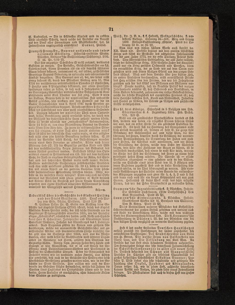 Weiß, Dr. I. V. v., k. k. Hofrath. Weltgeschichte. 3. ver-besserte Auflage. Lieferung 94—101. Graz und Leipzig 1W2. VcrlagS-Buchhandlung .Styria'. Preis der Lie-ferung 50 kr. — 85 Pf.