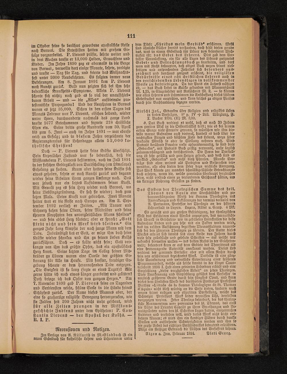 ES gereicht uns zur großen Befriedigung, der theologischenWelt das Erscheinen eines Werkes anzuzeigen, das voraussicht-lich überall in Gelehrten- wie in gebildeten Laicnkreisen die besteAufnahme finden und gar sehr mit ein Faktor werden wird,das im raschen Aufschwung begriffene Thomasstudium nament-lich bei den jüngeren Theologen zu fördern. Der Autor diesesWerkes erfreut sich bereits seit einer Reihe von Jahren durchviele sehr gründliche und gelehrte Schriften — auf welche wirnebenbei hinweisen wollen — des besten Rufes in der Gelehrten-wclt; besonders kann er auf dem Gebiete des Thomismuö alseine hervorragende Autorität anerkannt werden. Dieses Lobverdient der genannte Verfasser aber mit allem Rechte durchsein neu erschienenes bezeichnetes Werk. Dasselbe ist eine gänz-liche Umarbeitung und wesentliche Erweiterung einer früherenProgrammarbcit, welche als solche bereits in der Liuzer Quar-talschrift 1891 I. Heft einen gefeierten Lobredncr erhielt und eineEmpfehlung „dieser vorzüglichen Arbeit" an jeden Theologen.Diese Anerkennung und Empfehlung gebührt deni Verfasser inungleich größerem Grade durch sein jüngstes Opus, und kanndieses dem ähnlichen Werke des berühmten Frciburger ProfessorsBerthier >I/ötmIs cls ls, Lowmo Mreolog'iqno elo 8t. TlromaZä'^quin- nicht bloß würdig an die Seite treten, sondern mußwegen seiner ruhigen und objectiven Darstellung, welche desSchweizer Professors Werk leider vermissen läßt, demselbenvorgezogen werden. Jeder Theologe besonders, der das theolog-ische Llonumontum aero psrennins des hl. Thomas, das einstdie Vater des Tricnter Concils zu ihren Berathungen und Be-weisgründen neben den hl. Schriften liegen hatten, einigermaßenstudieren und verstehen will, wird dieses Werk nicht leicht ent-behren können; es wird ihm ein kundiger Führer durch dunkleStellen und aufstoßende Schwierigkeiten werden und ihm sodie große Arbeit des richtigen Verständnisses bedeutend erleichtern.Möge ein fleißiger Gebrauch die Mühen des Verfassers lohnen.