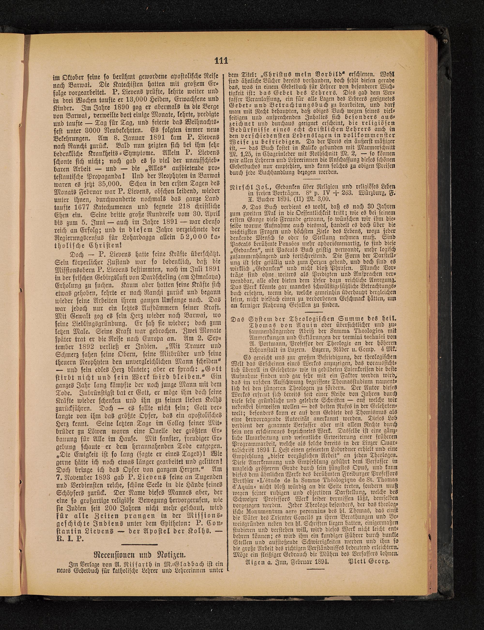Doch — k. Lievens hatte seine Kräfte überschätzt.Sein körperlicher Zustand war so bedenklich, daß dieMissionsobern k. Lievens bestimmten, noch im Juli 1891in der frischen Gcbirgsluft von Dardscheling (am Himalaya )Erholung zu suchen. Kaum aber hatten seine Kräfte sichetwas gehoben, kehrte er nach Ranchi zurück und begannwieder seine Arbeiten ihrem ganzen Umfange nach. Daswar jedoch nur ein letztes Aufdämmern seiner Kraft.Mit Gewalt zog es sein Herz wieder nach Barwai, woseine Lieblingsgründung. Er sah sie wieder; doch zumletzen Male. Seine Kraft war gebrochen. Zwei Monatespäter trat er die Reise nach Europa an. Am 2. Sep-tember 1892 verließ er Indien. „Mit Trauer undSchmerz sahen seine Obern, seine Mitbrüder und seinetheuern Neophyten den unvergleichlichen Mann scheiden"— und sein edles Herz blutete; aber er sprach: „Gott stirbt nicht und sein Werk wird bleiben." Einganzes Jahr lang kämpfte der noch junge Mann mit demTode. Inbrünstigst bat er Gott, er möge ihm doch feineKräfte wieder schenken und ihn zu seinen lieben Kolhszurückführen. Doch — es sollte nicht sein; Gott ver-langte von ihm das größte Opfer, das ein apostolischesHerz kennt. Seine letzten Tage im Colleg seiner Mit-brüder zu Löwen waren eine Quelle der größten Er-bauung für Alle im Hause. Mit sanfter, freudiger Er-gebung schaute er dem herannahenden Tode entgegen.„Die Ewigkeit ist so lang (sagte er eines Tages)! Wiegerne hätte ich noch etwas länger gearbeitet und gelitten!Doch bringe ich das Opfer von ganzem Herzen." Am7. November 1893 gab l?. Lievens seine an Tugendenund Verdiensten reiche, schöne Seele in die Hände seinesSchöpfers zurück. Der Name dieses Mannes aber, dereine so großartige religiöse Bewegung hervorgerufen, wiesie Indien seit 200 Jahren nicht mehr geschaut, wirdfür alle Zeiten prangen in der Missions-geschichte Indiens unter dem Epitheton: ?. Kon-stantin Lievens — der Apostel der Kolhs. —L. I. k.