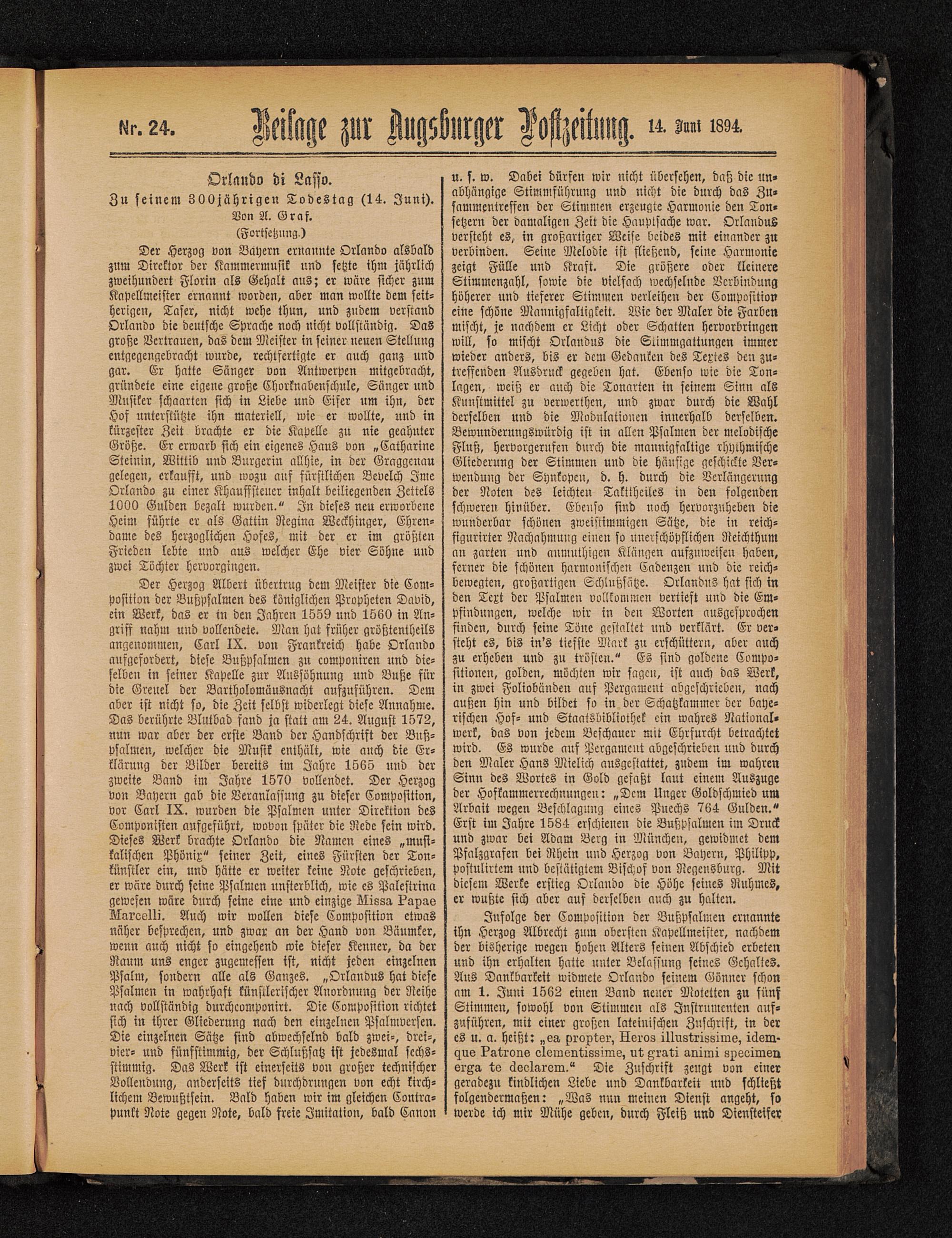 Der Herzog von Bayern ernannte Orlando alsbaldznm Direktor der Kammermusik und setzte ihm jährlichzweihundert Florin als Gehalt aus; er wäre sicher znmKapellmeister ernannt worden, aber man wollte dem seit-herigen, Laser, nicht wehe thun, und zudem verstandOrlando die deutsche Sprache noch nicht vollständig. DaSgroße Vertrauen, das dem Meister in seiner neuen Stellungentgegengebracht wurde, rechtfertigte er auch ganz undgar. Er hatte Sänger von Antwerpen mitgebracht,gründete eine eigene große Chorknabenschule, Sänger undMusiker schaarten sich in Liebe und Eifer um ihn, derHof unterstützte ihn materiell, wie er wollte, und inkürzester Zeit brachte er die Kapelle zu nie geahnterGröße. Er erwarb sich ein eigenes Haus von „CatharineStemm, Wittib und Bürgerin allhie, in der Graggcnaugelegen, erkaufst, und wozu auf fürstlichen Bevelch JmeOrlando zu einer Khauffstcuer inhalt beiliegenden Zettels1000 Gulden bezalt wurden." In dieses neu erworbeneHeim führte er als Gattin Regina Weckhinger, Ehren-dame des herzoglichen Hofes, mit der er im größtenFrieden lebte und aus welcher Ehe vier Söhne undzwei Töchter hervorgingen.