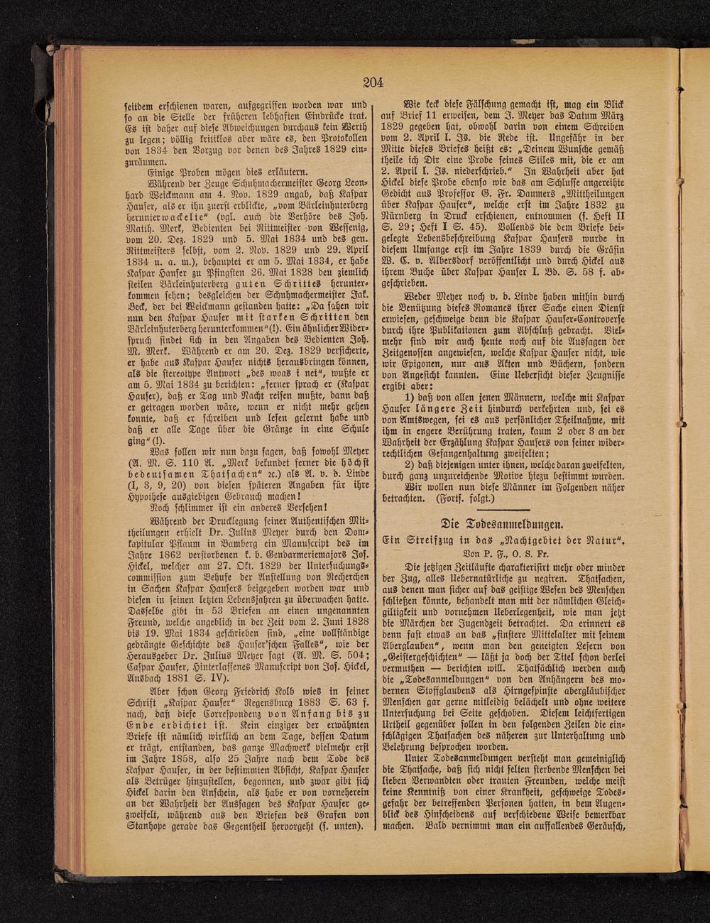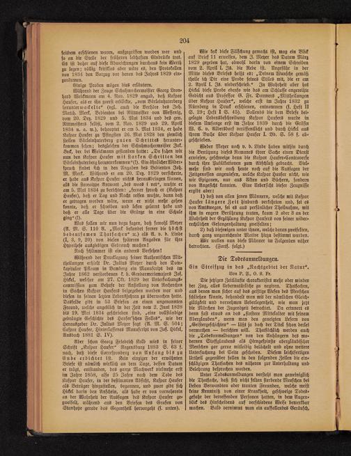 Aber schon Georg Friedrich Kolb wies in seinerSchrift „Kaspar Häuser" Ncgensburg 1883 S. 63 f.nach, daß diese Korrespondenz von Anfang bis zuEnde erdichtet ist. Kein einziger der erwähntenBriefe ist nämlich wirklich an dem Tage, dessen Datumer trügt, entstanden, das ganze Machwerk vielmehr erstim Jahre 1858, also 25 Jahre nach dem Tode desKaspar Häuser, in der bestimmten Absicht, Kaspar Häuserals Betrüger hinzustellen, begonnen, und zwar gibt sichHickel darin den Anschein, als habe er von vornehereinan der Wahrheit der Aussagen des Kaspar Häuser ge-zweifelt, während aus den Briefen des Grafen vonStanhope gerade das Gegentheil hervorgeht (s. unten).