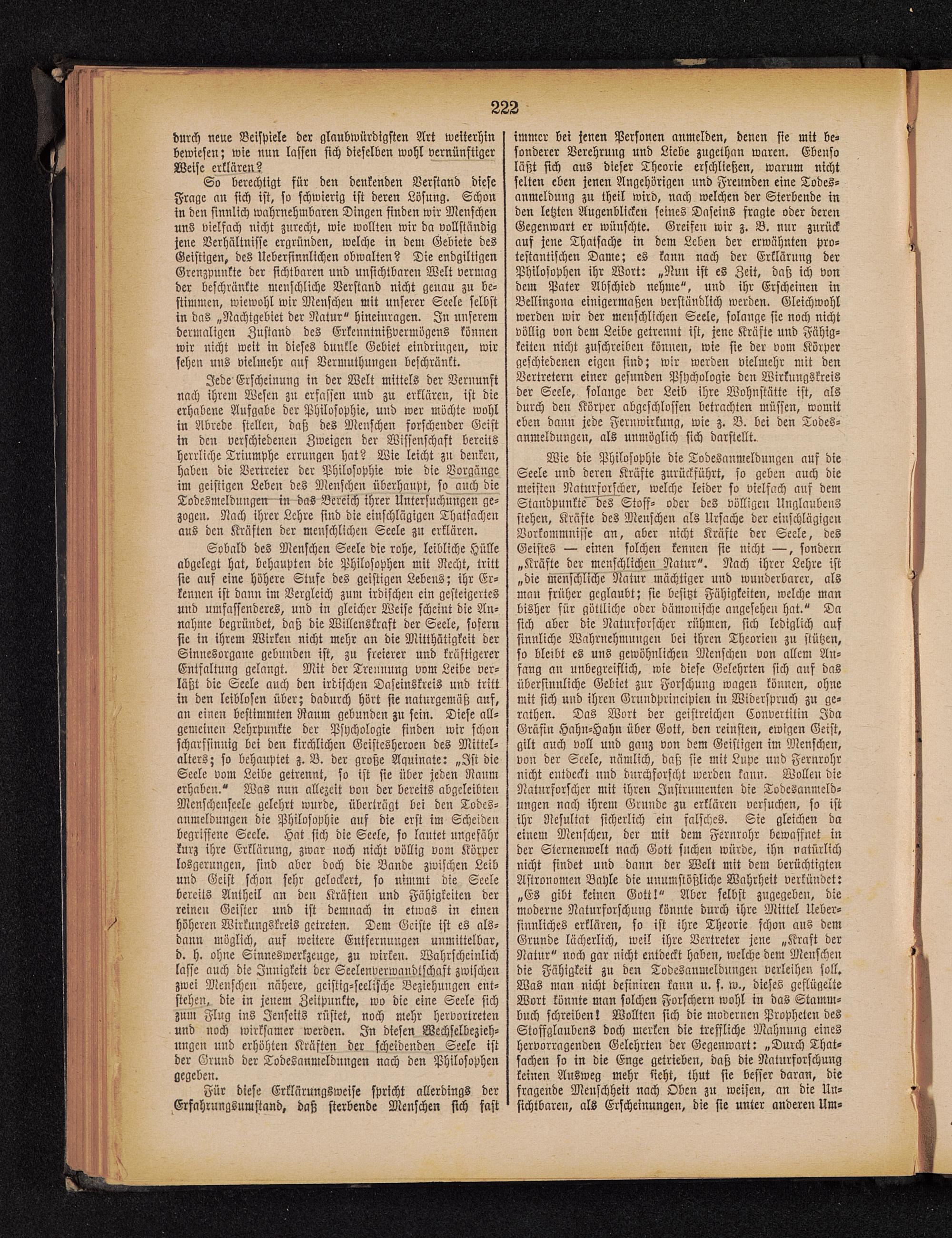 immer bei jenen Personen anmelden, denen sie mit be-sonderer Verehrung und Liebe zugethan waren. Ebensoläßt sich aus dieser Theorie erschließen, warum nichtselten eben jenen Angehörigen und Freunden eine Todes-anmeldung zu theil wird, nach welchen der Sterbende inden letzten Augenblicken seines Daseins fragte oder derenGegenwart er wünschte. Greifen wir z. B. nur zurückauf jene Thatsache in dem Leben der erwähnten pro-testantischen Dame; es kann nach der Erklärung derPhilosophen ihr Wort: „Nun ist es Zeit, daß ich vondem Pater Abschied nehme", und ihr Erscheinen inBellinzona einigermaßen verständlich werden. Gleichwohlwerden wir der menschlichen Seele, solange sie noch nichtvöllig von dem Leibe getrennt ist, jene Kräfte und Fähig-keiten nicht zuschreiben können, wie sie der vom Körpergeschiedenen eigen sind; wir werden vielmehr mit denVertretern einer gesunden Psychologie den Wirkungskreisder Seele, solange der Leib ihre Wohnstätte ist, alsdurch den Körper abgeschlossen betrachten müssen, womiteben dann jede Fernwirkung, wie z. V. bei den Todes-anmeldungen, als unmöglich sich darstellt.