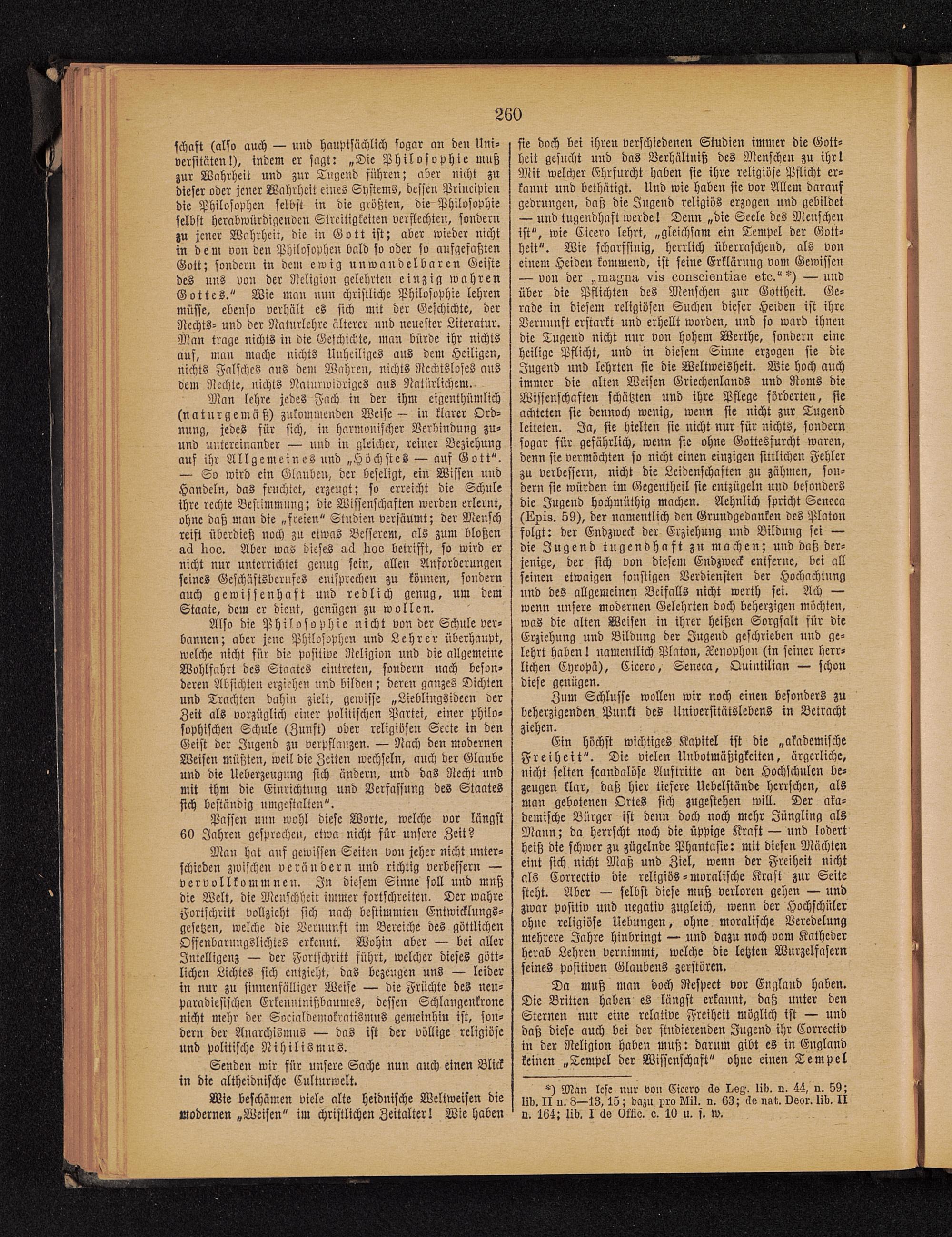 — von der „nruFnn vis aonsoisntüns etc."*) —undüber die Pflichten des Menschen zur Gottheit. Ge-rade in diesem religiösen Suchen dieser Heiden ist ihreVernunft erstarkt und erhellt worden, und so ward ihnendie Tugend nicht nur von hohem Werthe, sondern eineheilige Pflicht, und in diesem Sinne erzogen sie dieJugend und lehrten sie die Weltweisheit. Wie hoch auchimmer die alten Weisen Griechenlanos und Roms dieWissenschaften schätzten und ihre Pflege förderten, sieachteten sie dennoch wenig, wenn sie nicht zur Tugendleiteten. Ja, sie hielten sie nicht nur für nichts, sondernsogar für gefährlich, wenn sie ohne Gottesfurcht waren,denn sie vermöchten so nicht einen einzigen sittlichen Fehlerzu verbessern, nicht die Leidenschaften zu zähmen, son-dern sie würden im Gegentheil sie entzügeln und besondersdie Jugend hochmüthig machen. Aehnlich spricht Seneca (Lpto. 59), der namentlich den Grundgedanken des Platonfolgt: der Endzweck der Erziehung und Bildung sei —die Jugend tugendhaft zu machen; und daß der-jenige, der sich von diesem Endzweck entferne, bei allseinen etwaigen sonstigen Verdiensten der Hochachtungund des allgemeinen Beifalls nicht werth sei. Ach —wenn unsere modernen Gelehrten doch beherzigen möchten,was die alten Weisen in ihrer heißen Sorgfalt für dieErziehung und Bildung der Jugend geschrieben und ge-lehrt haben! namentlich Platon, L'cnophon (in seiner herr-lichen Cyropä), Cicero, Seneca , Quintilian — schondiese genügen.