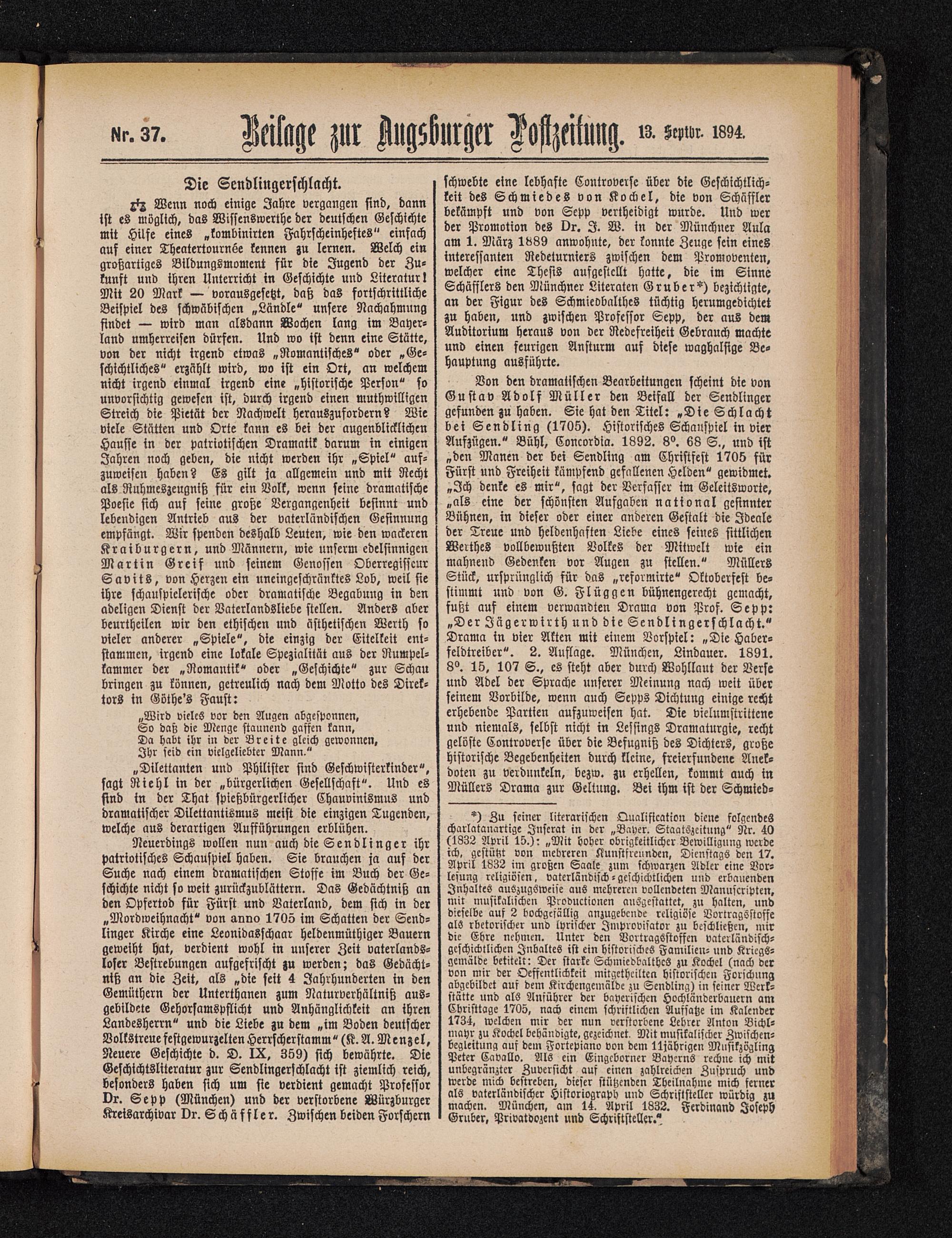 Neuerdings wollen nun auch die Sendlinger ihrpatriotisches Schauspiel haben. Sie brauchen ja auf derSuche nach einem dramatischen Stoffe im Buch der Ge-schichte nicht so weit zurückzublättern. Das Gedächtniß anden Opfertod für Fürst und Vaterland, dem sich in der„Mordweihnacht " von anno 1705 im Schatten der Send-linger Kirche eine Leonidasschaar heldenmüthiger Bauerngeweiht hat, verdient wohl in unserer Zeit vaterlands-loser Bestrebungen aufgefrischt zu werden; das Gedächt-niß an die Zeit, als „die seit 4 Jahrhunderten in denGemüthern der Unterthanen zum Naturverhältniß aus-gebildete Gehorsamspflicht und Anhänglichkeit an ihrenLandesherrn" und die Liebe zu dem „im Boden deutscherVolkstreue festgewurzelten Herrscherstamm" (K.A. Menzel,Neuere Geschichte d. D. IX, 359) sich bewährte. DieGeschichtsliteratur zur Sendlingerschlacht ist ziemlich reich,besonders haben sich um sie verdient gemacht ProfessorDr. Sepp (München) und der verstorbene Würzburger Kreisarchivar vr. Schäffler. Zwischen beiden Forschern