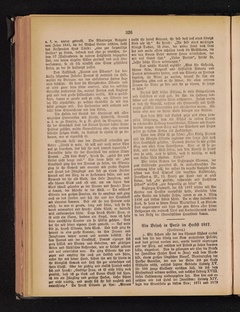 Das Volksbuch „Pontus und Sidonia" hat bei-läufig folgenden Inhalt: Pontus ist natürlich ein Held,welcher die Bretagne vor den einfallenden Heiden sieg-reich beschützt. Er liebt die Königstochter Sidonia undes wird zwar seine Liebe erwidert, aber der neidischeGendellet verleumdet ihn, worauf Pontus nach England geht und dort große Heldenthaten verübt. Als er zurück-kehrt, kommt er gerade noch zu recht, um Sidonia vonder Ehe abzuhalten, zu welcher Gendellet sie mit ihmselbst zwingen will. Der Verleumder wird entlarvt undbüßt seine Schandthaten mit dem Leben.