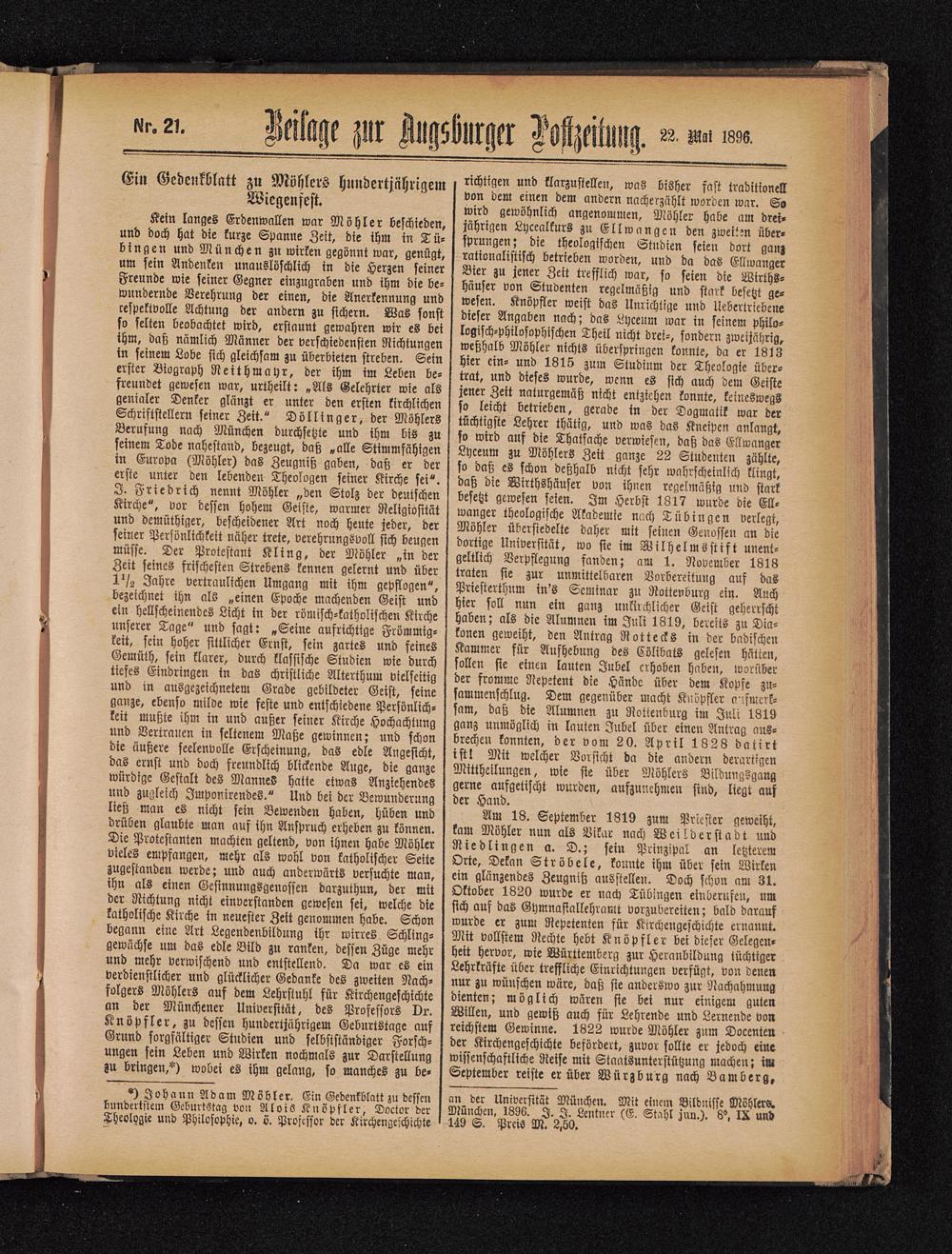 *) Johann Adam Möhler . Ein Gebenkblatt zu dessenhundertstem Geburtstag von AloiS Knöpfler , Doctor derTheologie und Philosophie, o. v. Professor der Kirchengeschichte