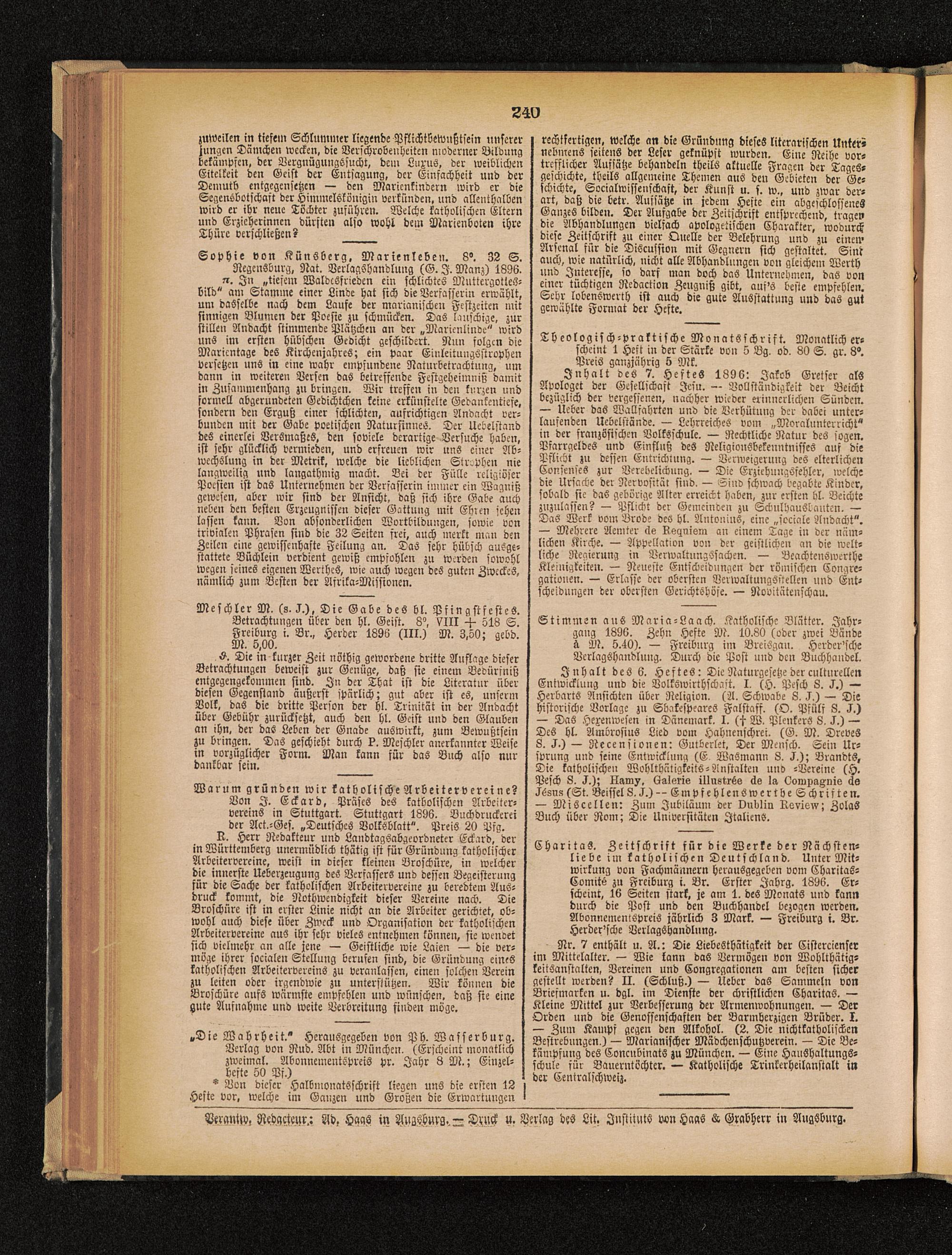 Warum gründen wir katholische Arbeiterv ereine?Von I. Eckard, Präses des katholischen Arbeiter-vereins in Stuttgart. Stuttgart 1896. Buchdruckereider Act.-Ges. „Deutsches Volksblatt". Preis 20 Pfg.