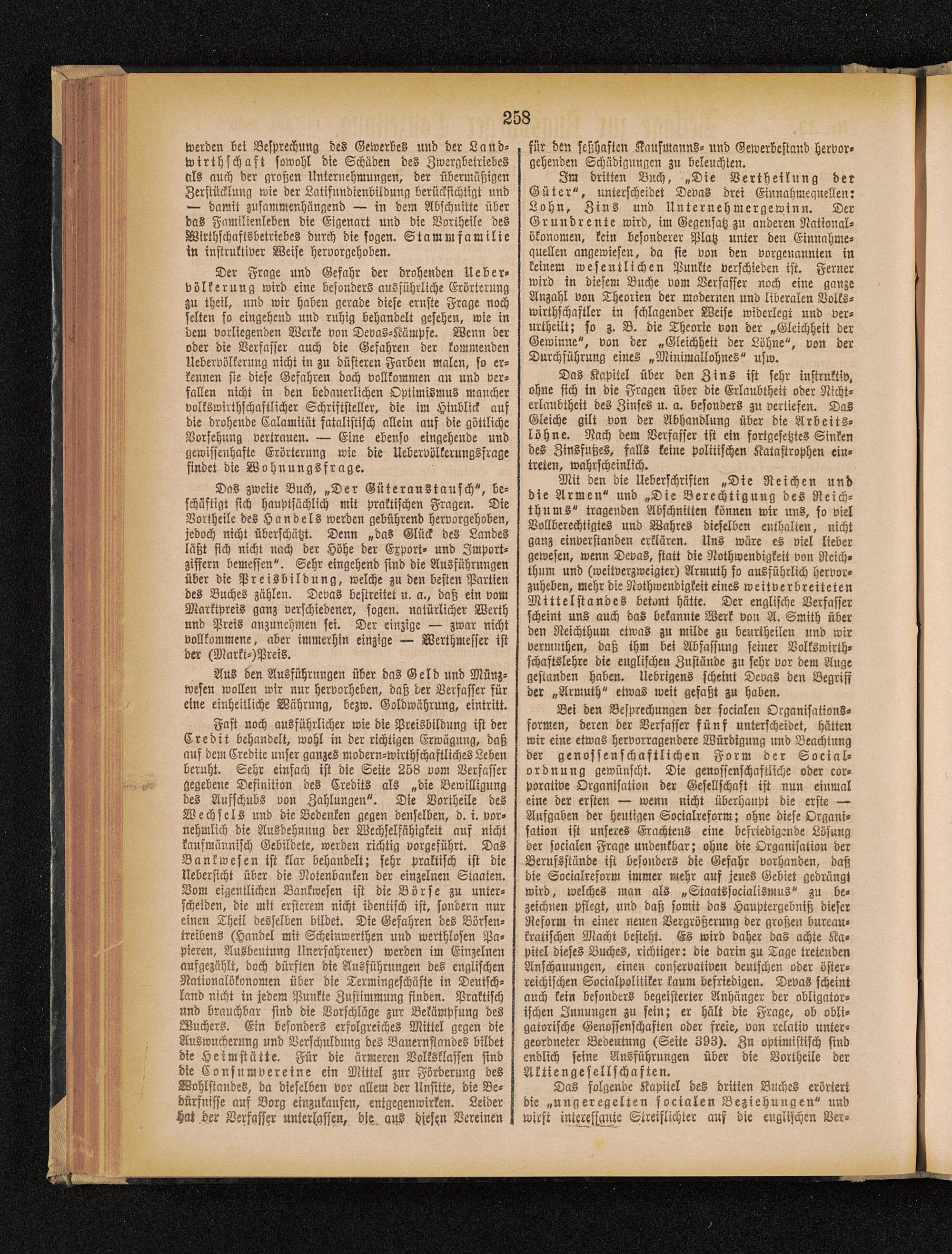 Das zweite Buch, „Der Güteraustausch", be-schäftigt sich hauptsächlich mit praktischen Fragen. DieVortheile des Handels werden gebührend hervorgehoben,jedoch nicht überschätzt. Denn „das Glück des Landesläßt sich nicht nach der Höhe der Export- und Import-ziffern bemessen". Sehr eingehend sind die Ausführungenüber die Preisbildung, welche zu den besten Partiendes Buches zählen. Devas bestreitet u. a>, daß ein vomMarktpreis ganz verschiedener, sogen, natürlicher Werthund Preis anzunehmen sei. Der einzige — zwar nichtvollkommene, aber immerhin einzige — Werthmesser istder (Markt-)Preis.