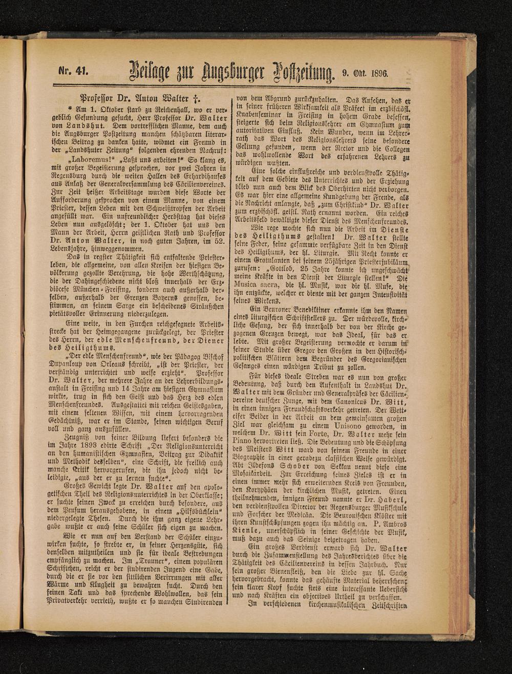 „I-udoreinns!" »Laßt uns arbeiten!" So klang es,mit großer Begeisterung gesprochen, vor zwei Jahren inRegensburg durch die weiten Hallen des Erhardihausesaus Anlaß der Generalversammlung des Cäcilienvereines.Zur Zeit heißer Arbeitstage wurden diese Worte derAufforderung gesprochen von einem Manne, von einemPriester, dessen Leben mit den Schweißtropfen der Arbeitangefüllt war. Ein unfreundlicher Herbsttag hat diesesLeben nun ausgelöscht; der 1. Oktober hat uns denMann der Arbeit, Herrn geistlichen Rath und ProfessorDr. Anton Walter, in noch guten Jahren, im 52.Lebensjahre, hinweggenommen.
