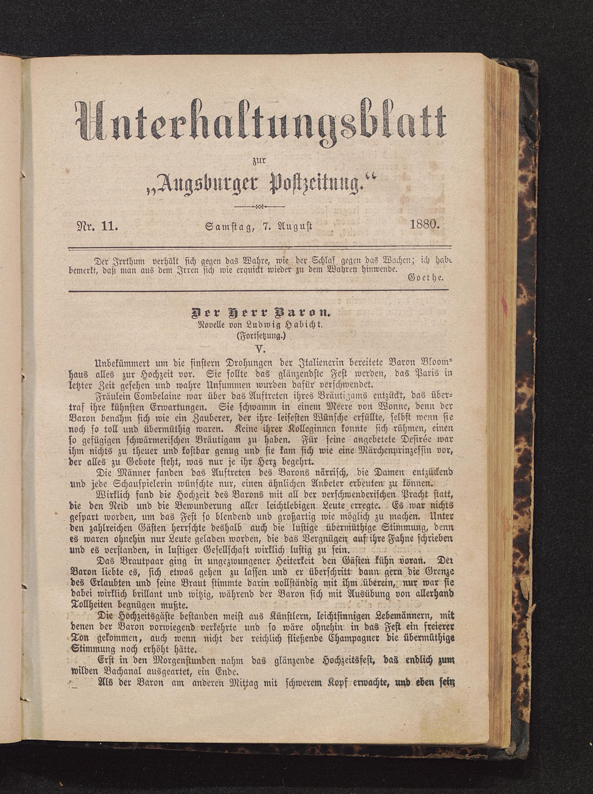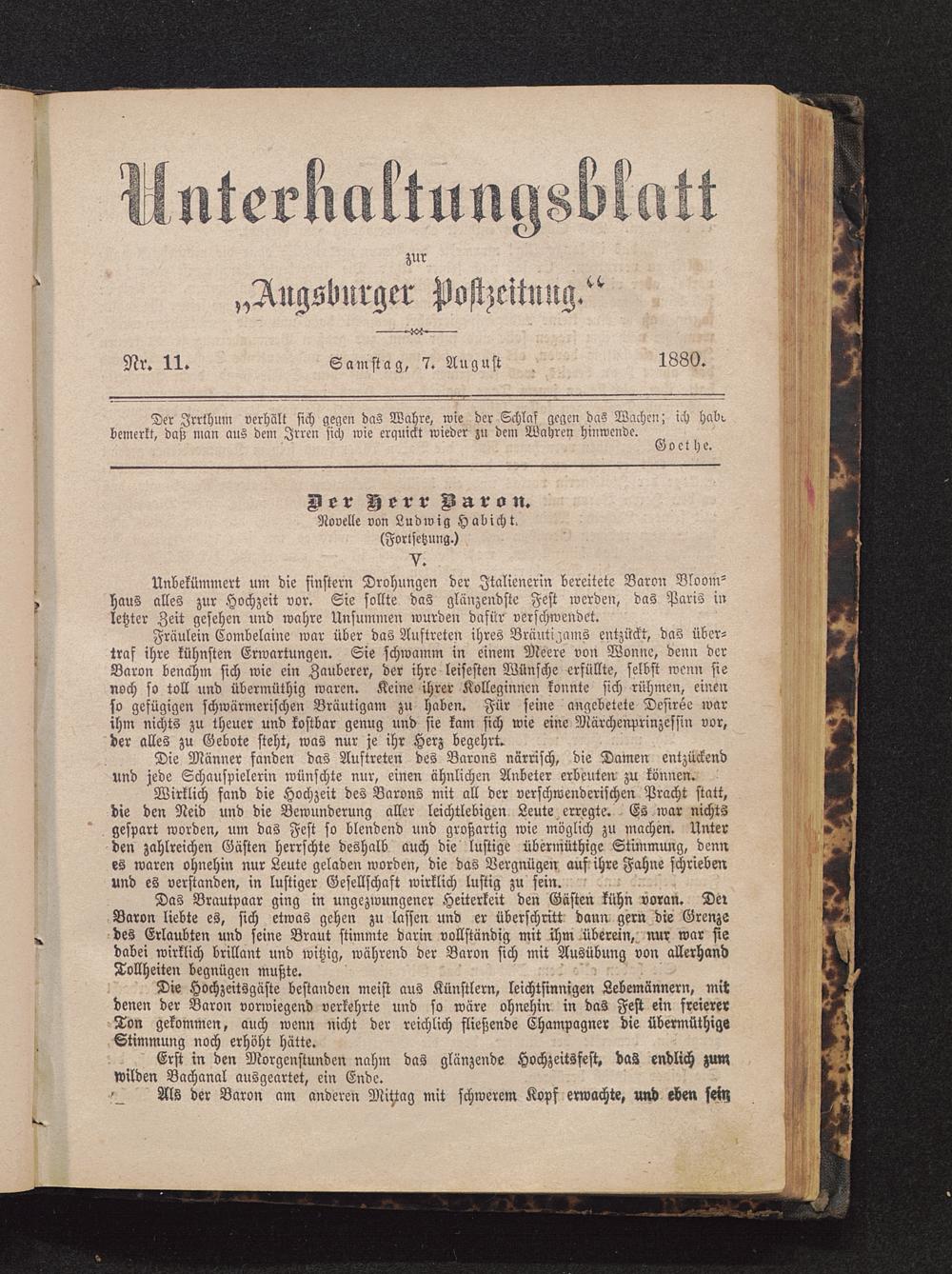 Die Hochzeitsgäste bestanden meist aus Künstlem, leichtsinnigen Lebemännern, mitdenen der Baron vorwiegend verkehrte und so wäre ohnehin in das Fest ein freiererTon gekommen, auch wenn nicht der reichlich fließende Champagner die übermüthig«Stimmung noch erhöht hätte.