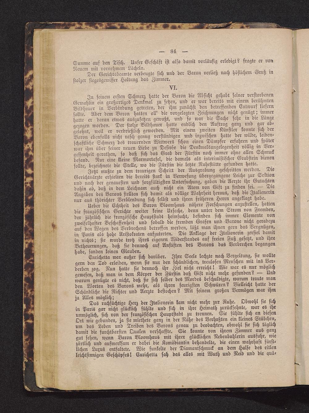 Das rachsüchtige Herz der Italienerin kam nicht mehr zur Ruhe. Obwohl sie sichin Paris gar nicht glücklich fühlte und sich in ihre Heimath zurücksehnte, war es ihrunmöglich, sich von der französischen Hauptstadt zu trennen. Sie fühlte sich an diesenOrt wie gebunden, ja sie miethete ganz in der Nähe des Verhaßten ein kleines Stübchen,um das Leben und Treiben des Barons genau zu beobachten, obwohl sie sich täglichdamit die furchtbarsten Qualen verschaffte. Sie konnte von ihrem Zimmer aus ganzgut sehen, wenn Baron Bloomhaus mit ihrer glücklichen Nebenbuhlerin ausfuhr, wiezärtlich und aufmerksam er dabei die Komödiantin behandelte, die einen wahrhaft fürst-lichen Luxus entfaltete. Wie funkelte der Diamantschmuck an dem Halse des eitlenleichtsinnigen Geschöpfes! Enrichetta sah das alles mit Wuth und Neid und die quä-