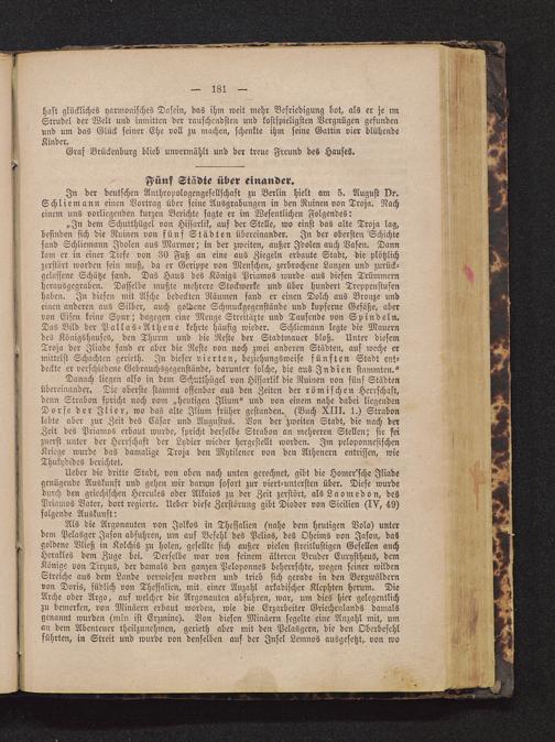 „In dem Schutthügel von Hissarlik, auf der Stelle, wo einst das alte Troja lag,befinden sich die Ruinen von fünf Städten übereinander. In der obersten Schichtefand Schliemann Idolen aus Marmor; in der zweiten, außer Idolen auch Vasen. Dannkam er in einer Tiefe von 30 Fuß an eine aus Ziegeln erbaute Stadt, die plötzlichzerstört worden sein muß, da er Gerippe von Menschen, zerbrochene Lanzen und zurück-gelassene Schätze fand. Das Haus des Königs Priamos wurde aus diesen Trümmernhcrausgegraben. Dasselbe mußte mehrere Stockwerke und über hundert Treppenstufenhaben. In diesen mit Asche bedeckten Räumen fand er einen Dolch aus Bronze undeinen anderen aus Silber, auch goldene Schmuckgegenstände und kupferne Gefäße, abervon Eisen keine Spur; dagegen eine Menge Streitäxte und Tausende von Spindeln.Das Bild der Pallas-Athene kehrte häufig wieder. Schliemann legte die Mauerndes Königshauses, den Thurm und die Reste der Stadtmauer bloß. Unter diesemTroja der Jliade fand er aber die Neste von noch zwei anderen Städten, auf weche ermittelst Schachten gerieth. In dieser vierten, beziehungsweise fünften Stadt erst.deckte er verschiedene Gebrauchsgegenstände, darunter solche, die aus Indien stammten."