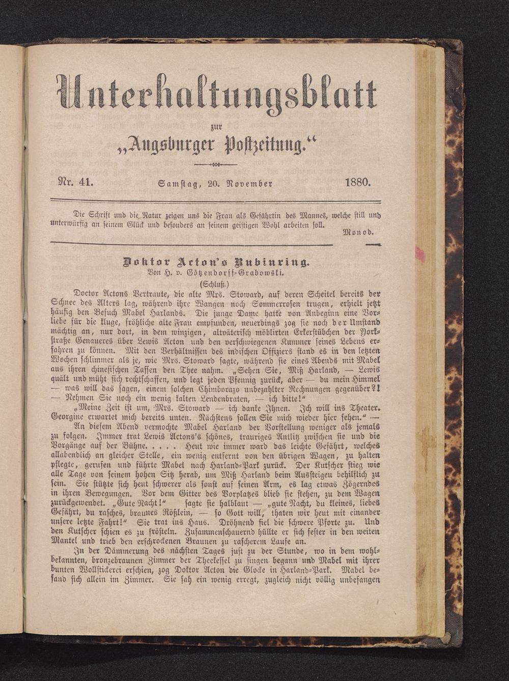 An diesem Abend vermochte Mabel Harland der Vorstellung weniger als jemalszu folgen. Immer trat Lewis Actons's schönes, trauriges Antlitz zwischen sie und dieVorgänge auf der Bühne. .... Heut wie immer ward das leichte Gefährt, welchesallabendlich an gleicher Stelle, ein wenig entfernt von den übrigen Wagen, zu haltenpflegte, gerufen und führte Mabel nach Harland-Park zurück. Der Kutscher stieg wiealle Tage von seinem hohen Sitz herab, um Miß Harland beim Aussteigeu behilflich zusein. Sie stützte sich heut schwerer als sonst auf seinen Arm, es lag etwas Zögerndesin ihren Bewegungen. Vor dem Gitter des Vorplatzes blieb sie stehen, zu dem Wagenzurückgewendet. „Gute Nacht!" sagte sie halblaut — „gute Nacht, du kleines, liebesGefährt, du rasches, braunes Rößlein, — so Gott will, thaten wir heut mit einanderunsere letzte Fahrt!" Sie trat ins Haus. Dröhnend fiel die schwere Pforte zu. Undden Kutscher schien es zu frösteln. Zusammenschauernd hüllte er sich fester in den weitenMantel und trieb den erschrockenen Braunen zu rascherem Laufe an.