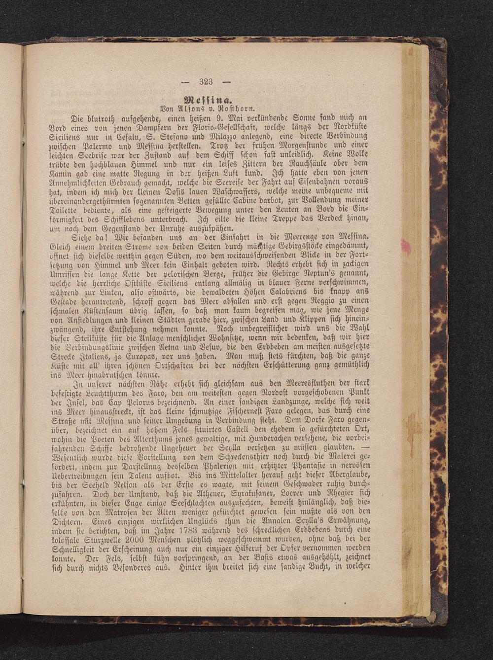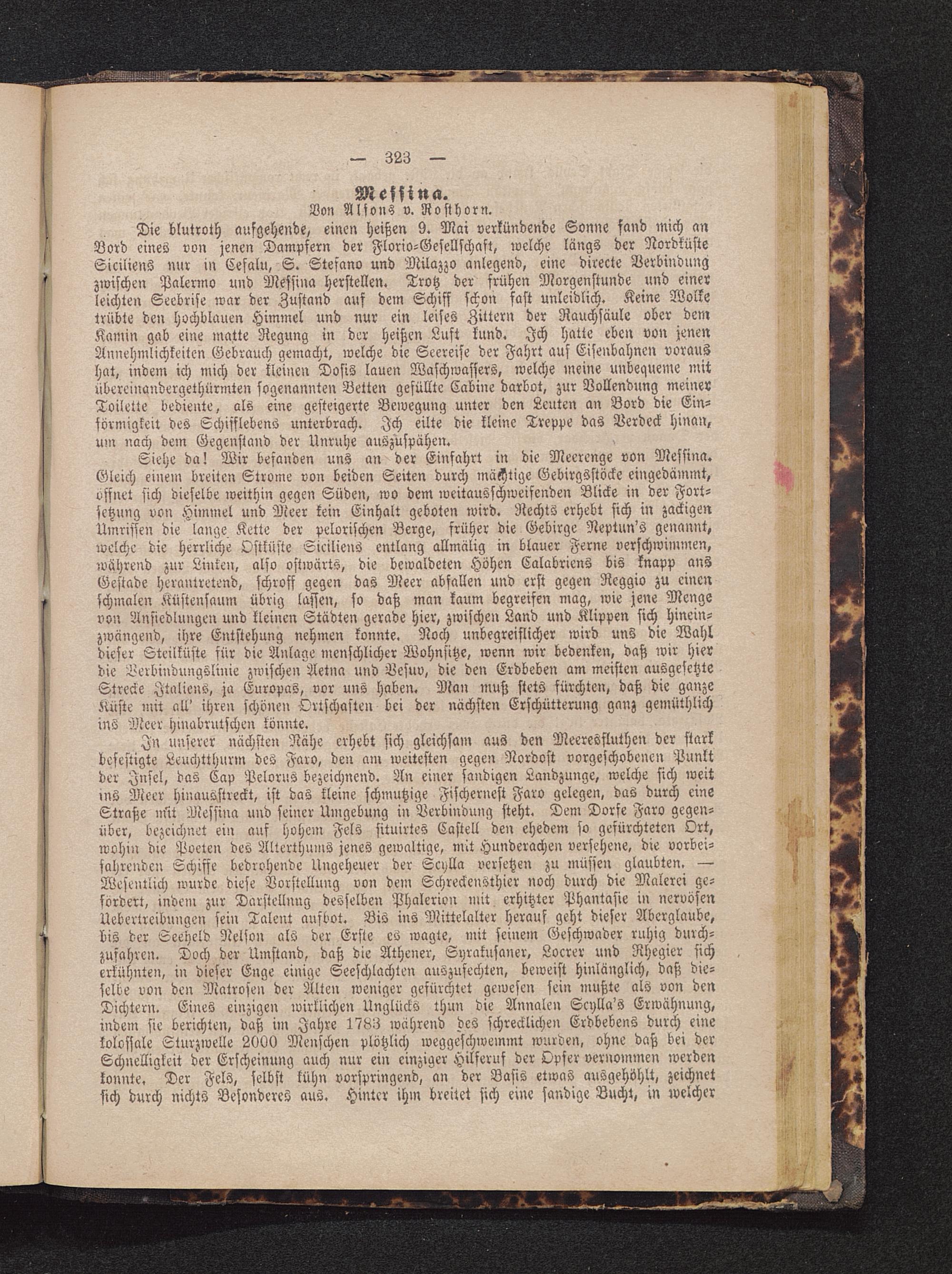In unserer nächsten Nähe erhebt sich gleichsam aus den Meeresfluthen der starkbefestigte Leuchtthurm des Faro , den am weitesten gegen Nordost vorgeschobenen Punktder Insel, das Cap Pelorus bezeichnend. An einer sandigen Landzunge, welche sich weitins Meer hinausstreckt, ist das kleine schmutzige Fischernest Faro gelegen, das durch eineStraße mit Messina und seiner Umgebung in Verbindung steht. Dem Dorfe Faro gegen-über, bezeichnet ein auf hohem Fels situirtes Castell den ehedem so gefurchtsten Ort,wohin die Poeten des Alterthums jenes gewaltige, mit Hunderachen versehene, die vorbei-fahrenden Schiffe bedrohende Ungeheuer der Scylla versetzen zu müssen glaubten. —Wesentlich wurde diese Vorstellung von dem SchreckenSthier noch durch die Malerei ge-fördert, indem zur Darstellung desselben Phalerion mit. erhitzter Phantasie in nervösenUebertreibungen sein Talent aufbot. Bis ins Mittelalter herauf geht dieser Aberglaube,bis der Leeheld Nelson als der Erste es wagte, mit seinem Geschwader ruhig durch-zuführen. Doch der Umstand, daß die Athener, Syrakusaner, Locrer und Rhegier sicherkühnten, in dieser Enge einige Seeschlachten auszufechten, beweist hinlänglich, daß die-selbe von den Matrosen der Alten weniger gefürchtet gewesen sein mußte als von denDichtern. Eines einzigen wirklichen Unglücks thun die Annalen Scylla's Erwähnung,indem sie berichten, daß im Jahre 1733 wahrend des schrecklichen Erdbebens durch einekolossale Sturzwelle 2000 Menschen plötzlich weggeschwemmt wurden, ohne daß bei derSchnelligkeit der Erscheinung auch nur ein einziger Hilferuf der Opfer vernommen werdenkonnte. Der Fels, selbst kühn vorspringend, an der Basis etwas ausgehöhlt, zeichnetsich durch nichts Besonderes aus. Hinter ihm breitet sich eine sandige Bucht, in welcher