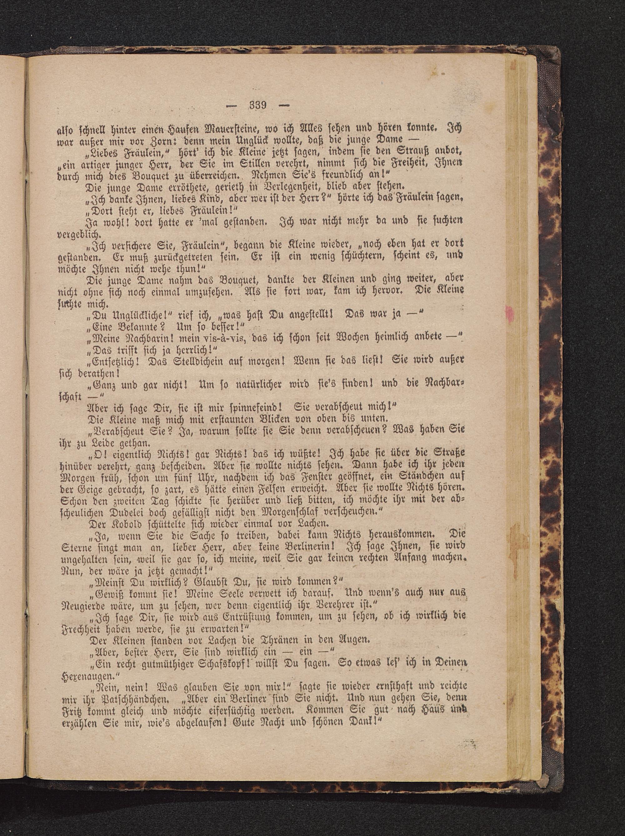 „Liebes Fräulein," hört' ich die Kleine jetzt sagen, indem sie den Strauß anbot,„ein artiger junger Herr, der Sie im Stillen verehrt, nimmt sich die Freiheit, Ihnendurch mich dies Bouquct zu überreichen., Nehmen Sie's freundlich an!"