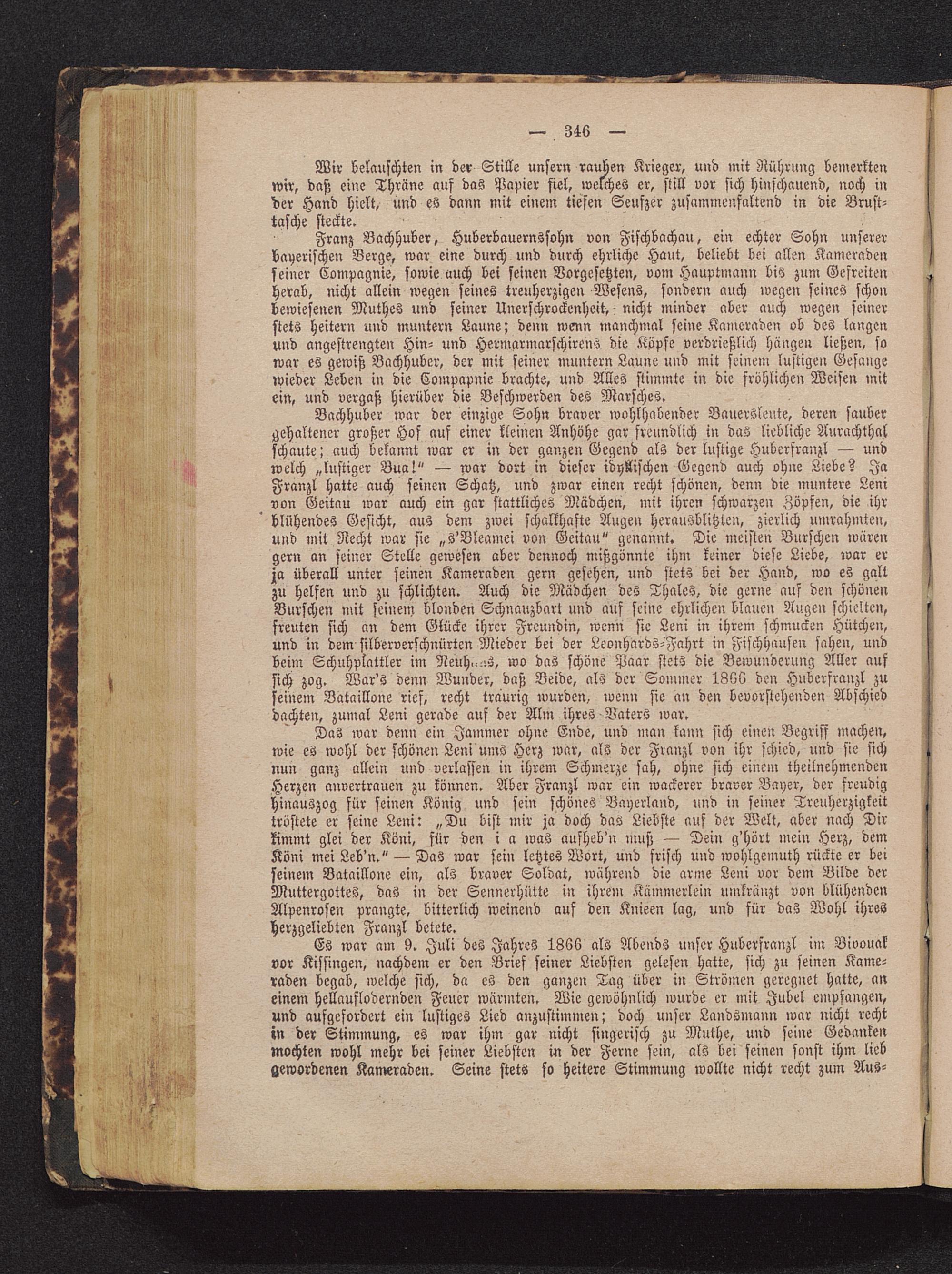 Franz Bachhuber, Huberbauernssohn von Fifchbachau, ein echter Sohn unsererbayerischen Berge, war eine durch und durch ehrliche Haut, beliebt bei allen Kameradenseiner Compagnie, sowie auch bei seinen Vorgesetzten, vom Hauptmann bis zum Gefreitenherab, nicht allein wegen seines treuherzigen Wesens, sondern auch wegen seines schonbewiesenen Muthes und seiner Unerschrockenheit, i nicht minder aber auch wegen seinerstets heitern und muntern Laune; denn wenn manchmal seine Kameraden ob des langenund angestrengten Hin- und Hermarmarschirens die Köpfe verdrießlich hängen ließen, sowar es gewiß Bachhuber, der mit seiner muntern Laune und mit seinem lustigen Gesängewieder Leben in die Compapnie brachte, und Alles stimmte in die fröhlichen Weisen mitein, und vergaß hierüber die Beschwerden des Marsches.