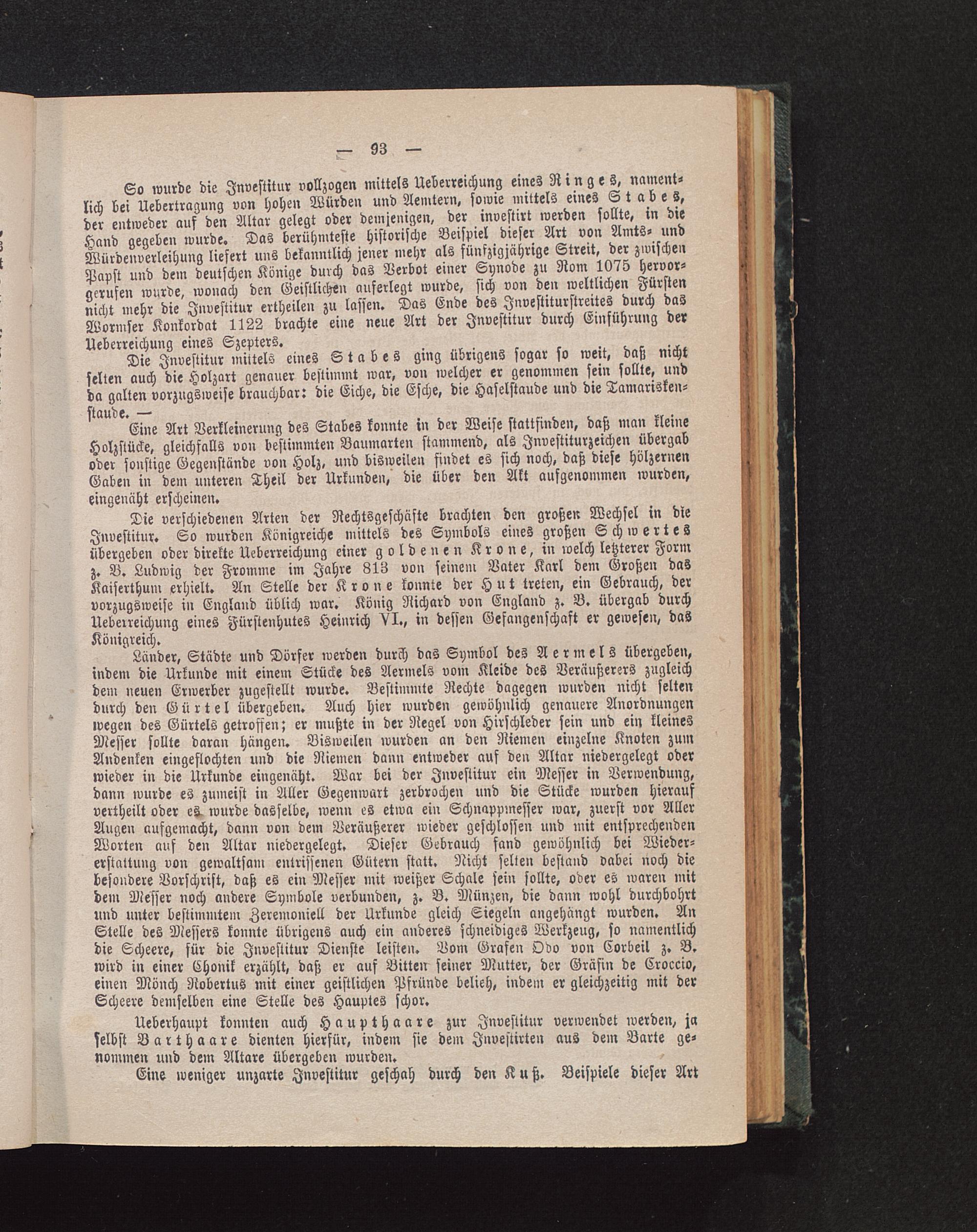 So wurde die Investitur vollzogen mittels Überreichung eines Ringes, nament-lich bei Uebertragung von hohen Würden und Aemtern, sowie mittels eines Stabes,der entweder auf den Altar gelegt oder demjenigen, der investirt werden sollte, in dieHand gegeben wurde. Das berühmteste historische Beispiel dieser Art von Amts- undWürdenverleihung liefert uns bekanntlich jener mehr als fünfzigjährige Streit, der zwischenPapst und dem deutschen Könige durch das Verbot einer Synode zu Nom 1075 hervor-gerufen wurde, wonach den Geistlichen auferlegt wurde, sich von den weltlichen Fürstennicht mehr die Investitur ertheilen zu lassen. Das Ende des Jnvestiturstreites durch dasWormser Konkordat 1122 brachte eine neue Art der Investitur durch Einführung derUeberreichung eines Szepters.