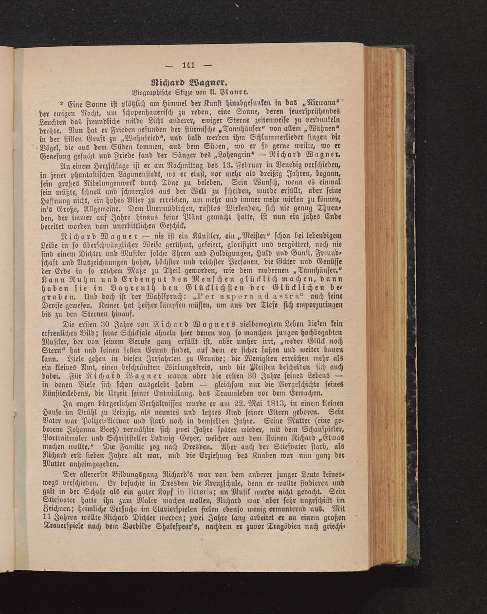 Der allererste Bildungsgang Richards war von dem anderer junger Leute keines-wegs verschieden. Er besuchte in Dresden die Kreuzschule, denn er wollte studieren undgalt in der Schule als ein guter Kopf in litteris; an Musik wurde nicht gedacht. SeinStiefvater hatte ihn zum Maler machen wollen, Richard war aber sehr ungeschickt imZeichnen; heimliche Versuche im Clavierspielen sielen ebenso wenig ermunternd aus. Mit11 Jahren wollte Richard Dichter werden; zwei Jahre lang arbeitet er an einen: großenTrauerspiele nach dem Vorbilde Shakespear's , nachdem er zuvor Tragödien nach griechi-