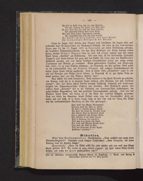 Schon im Jahre 1867 siedelte aber Wagner nach Triebschen bei Luzern über undvollendete dort die Composition der Nibelungen-Trilogie, die dann an den denkwürdigenTagen vom 13. bis 17. August 1876 in Bayreuth zur ersten Aufführung gelangte.In demselben Bühnenfestspielhause, das ihm seine Anhänger und König Ludwig erbauthatten, brachte Richard Wagner dann im Juli des vorigen Jahres auch sein letztesWerk, seinen „Parsifal " zur Aufführung. Wie man sieht, ist die künstlerische ThätigkeitWagner's Zeit seines Lebens fast ganz auf das Gebiet der Oper oder des Musikdraina'sbeschränkt gewesen und von seinen sonstigen Compositionen wären nur einige wenigeOuvertüren und Märsche zu erwähnen. Seine gesammelten Schriften und Dichtungensind 1870—71 in neun Bänden erschienen. In Bayreuth , wo sein größtes Werk zuerstan die Öffentlichkeit trat, hat Richard Wagner mit wenigen Unterbrechungen dieletzten Jahre seines Lebens zugebracht. Dort in seiner Villa „Wahnfried " ruhte er ausvon den Kämpfen und Mühen seines Lebens, in Bayreuth ist er zur letzten Ruhe ge-bettet worden, dort „wo sein Wähnen Frieden fand."