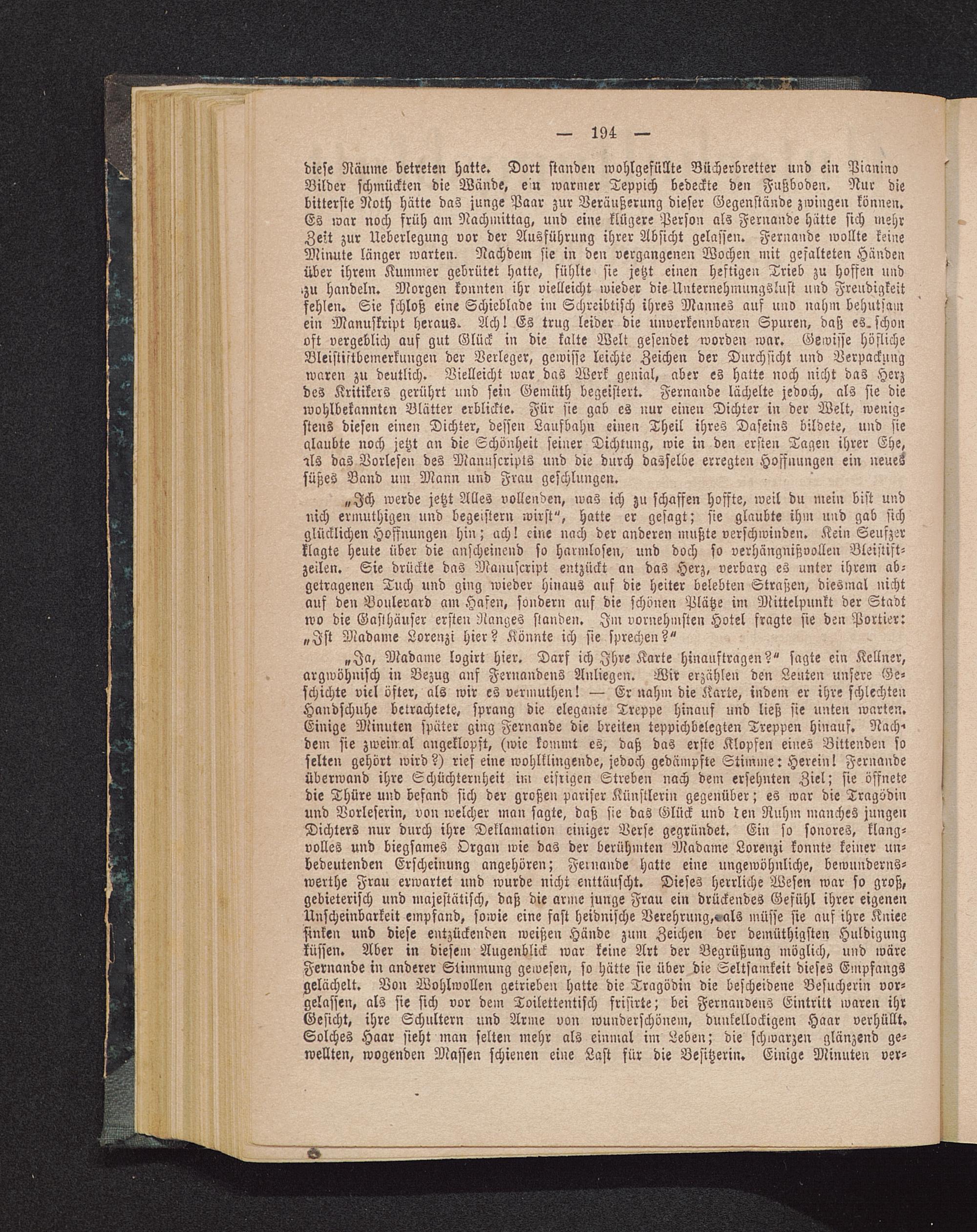 „Ja, Madame logirt hier. Darf ich Ihre Karte hinauftragen?" sagte ein Kellner,argwöhnisch in Bezug auf Fsrnandens Anliegen. Wir erzählen den Leuten unsere Ge-schichte viel öfter, als wir es vermuthen! — Er nahm die Karte, indem er ihre schlechtenHandschuhe betrachtete, sprang die elegante Treppe hinauf und ließ sie unten warten.Einige Minuten später ging Fernande die breiten teppichbelegten Treppen hinauf. Nach-dem sie zweimal angeklopft, (wie kommt es, daß das erste Klopfen eines Bittenden soselten gehört wird?) rief eine wohlklingende, jedoch gedämpfte Stimme: Herein! Fernandeüberwand ihre Schüchternheit im eifrigen Streben nach dem ersehnten Ziel; sie öffnetedie Thüre und befand sich der großen pariser Künstlerin gegenüber; es war die Tragödinund Vorleserin, von welcher man sagte, daß sie das Glück und den Ruhm manches jungenDichters nur durch ihre Deklamation einiger Verse gegründet. Ein so sonores, klang-volles und biegsames Organ wie das der berühmten Madame Lorenzi konnte keiner un-bedeutenden Erscheinung angehören; Fernande hatte eine ungewöhnliche, bewunderns-werthe Frau erwartet und wurde nicht enttäuscht. Dieses herrliche Wesen war so groß,gebieterisch und majestätisch, daß die arme junge Frau ein drückendes Gefühl ihrer eigenenÜnscheinbarkeit empfand, sowie eine fast heidnische Verehrung,»als müsse sie auf ihre Knieesinken und diese entzückenden weißen Hände zum Zeichen der demüthigsten Huldigungküssen. Aber in diesem Augenblick war keine Art der Begrüßung möglich, und wäreFernande in anderer Stimmung gewesen, so hätte sie über die Seltsamkeit dieses Empfangsgelächelt. Von Wohlwollen getrieben hatte die Tragödin die bescheidene Besucherin vor-gelassen, als sie sich vor dem Toilettentisch frisirte; bei Fernanvens Eintritt waren ihrGesicht, ihre Schultern und Arme von wunderschönem, dunkellockigem Haar verhüllt«Solches Haar sieht man selten mehr als einmal im Leben; die schwarzen glänzend ge-wellten, wogenden Massen schienen eine Last für die Besitzerin. Einige Minuten vsr-