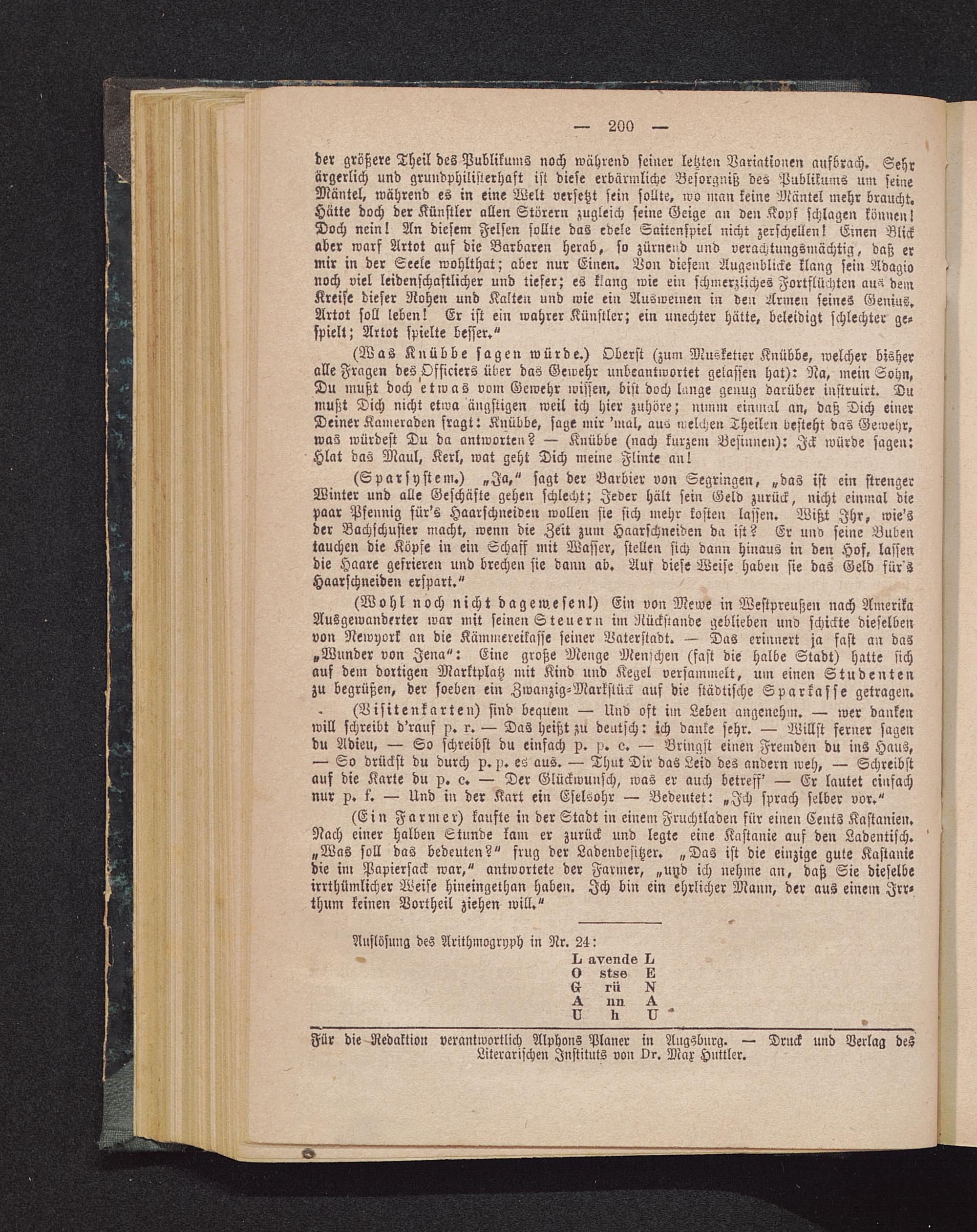 der größere Theil des Publikums noch während seiner letzten Variationen aufbrach. Sehr -ärgerlich und grundphilisterhaft ist diese erbärmliche Besorgnis; des Publikums um seineMantel, während es in eine Welt versetzt sein sollte, wo man keine Mantel mehr braucht.Hätte doch der Künstler allen Störern zugleich seine Geige an den Kons schlagen können!