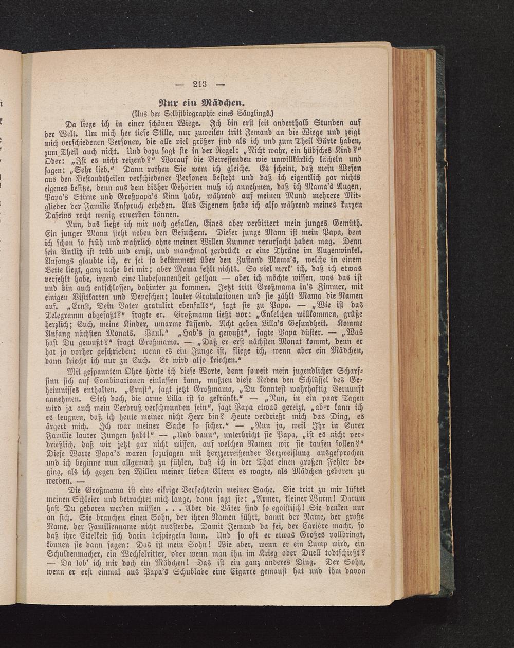 Da liege ich in einer schönen Wiege. Ich bin erst seit anderthalb Stunden aufder Welt. Üm mich her tiefe Stille, nur zuweilen tritt Jemand an die Wiege und zeigtmich verschiedenen Personen, die alle viel größer sind als ich und zum Theil Bärte haben,zum Theil auch nicht. Und dazu sagt sie in der Negel: „Nicht wahr, ein hübsches Kind?"Oder: „Ist es nicht reizend?" Worauf die Betreffenden wie unwillkürlich lächeln undsagen: „Sehr lieb." Dann rathen Sie wem ich gleiche. Es scheint, daß mein Wesenaus den Bestandtheilen verschiedener Personen besteht und daß ich eigentlich gar nichtseigenes besitze, denn aus dem bisher Gehörten muß ich annehmen, daß ich Mama's Augen»Papa's Stirne und Großpapa's Kinn habe, während auf meinen Mund mehrere Mit-glieder der Familie Anspruch erheben. Aus Eigenem habe ich also während meines kurzenDaseins recht wenig erwerben können.