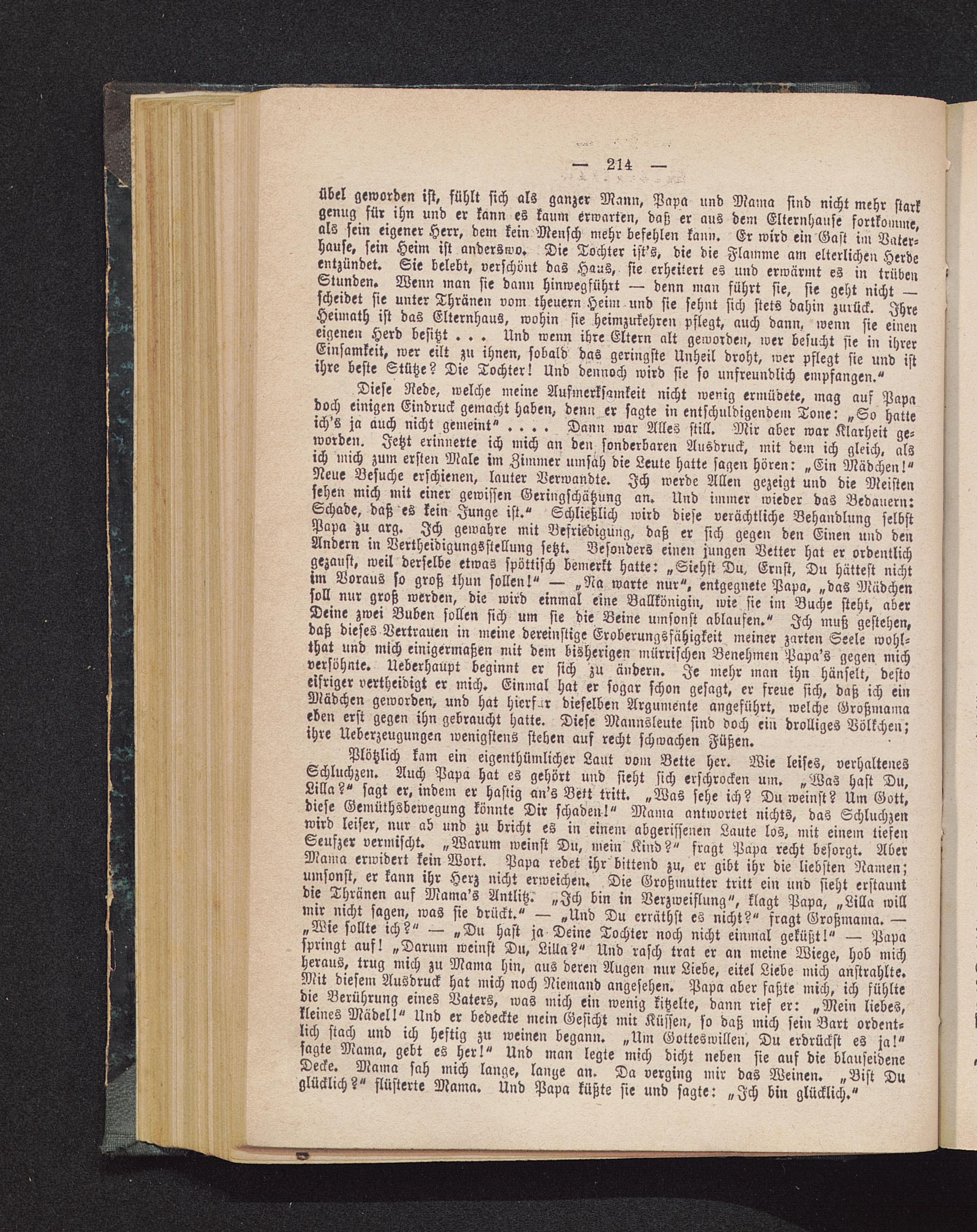 Plötzlich kam ein eigenthümlicher Laut vom Bette her. Wie leises, verhaltenesSchluchzen. Auch Papa hat es gehört und sieht sich erschrocken um. „Was hast Du,Lilla?" sagt er, indem er hastig an's Bett tritt. „Was sehe ich? Du weinst? Um Gott,diese Gemüthsbewegung könnte Dir schaden!" Mama antwortet nichts, das Schluchzenwird leiser, nur ab und zu bricht es in einem abgerissenen Laute los, mit einem tiefenSeufzer vermischt. „Warum weinst Du, mein Kind?" fragt Papa recht besorgt. AberMama erwidert kein Wort. Papa redet ihr bittend zu, er gibt ihr die liebsten Namen;umsonst, er kann ihr Herz nicht erweichen. Die Großmutter tritt ein und sieht erstauntdie Thränen auf Mama's Antlitz.' „Ich bin in Verzweiflung", klagt Papa, „Lilla willmir nicht sagen, was sie drückt." — „Und Du erräthst es nicht?" fragt Großmama. —„Wie sollte ich?" — „Du hast ja Deine Tochter noch nicht einmal geküßt!" — Papaspringt auf! „Darum weinst Du, Lilla?" Und rasch trat er an meine Wiege, hob michheraus, trug mich zu Mama hin, aus deren Augen nur Liebe, eitel Liebe mich anstrahlte.Mit diesem Ausdruck hat mich noch Niemand angesehen. Papa aber faßte mich, ich fühltedie Berührung eines Vaters, was mich ein wenig kitzelte, dann rief er: „Mein liebes,kleines Mädel!" Und er bedeckte mein Gesicht mir Küssen, so daß mich sein Bart ordent-lich stach und ich heftig zu weinen begann. „Um Gvttesmillen, Du erdrückst es ja!"sagte Mama, gebt es her!" Und man legte mich dicht neben sie auf die blauseideneDecke. Mama sah mich lange, lange an. Da verging mir das Weinen. „Bist Duglücklich?" flüsterte Mama. Und Papa küßte sie und sagte: „Ich bin glücklich."
