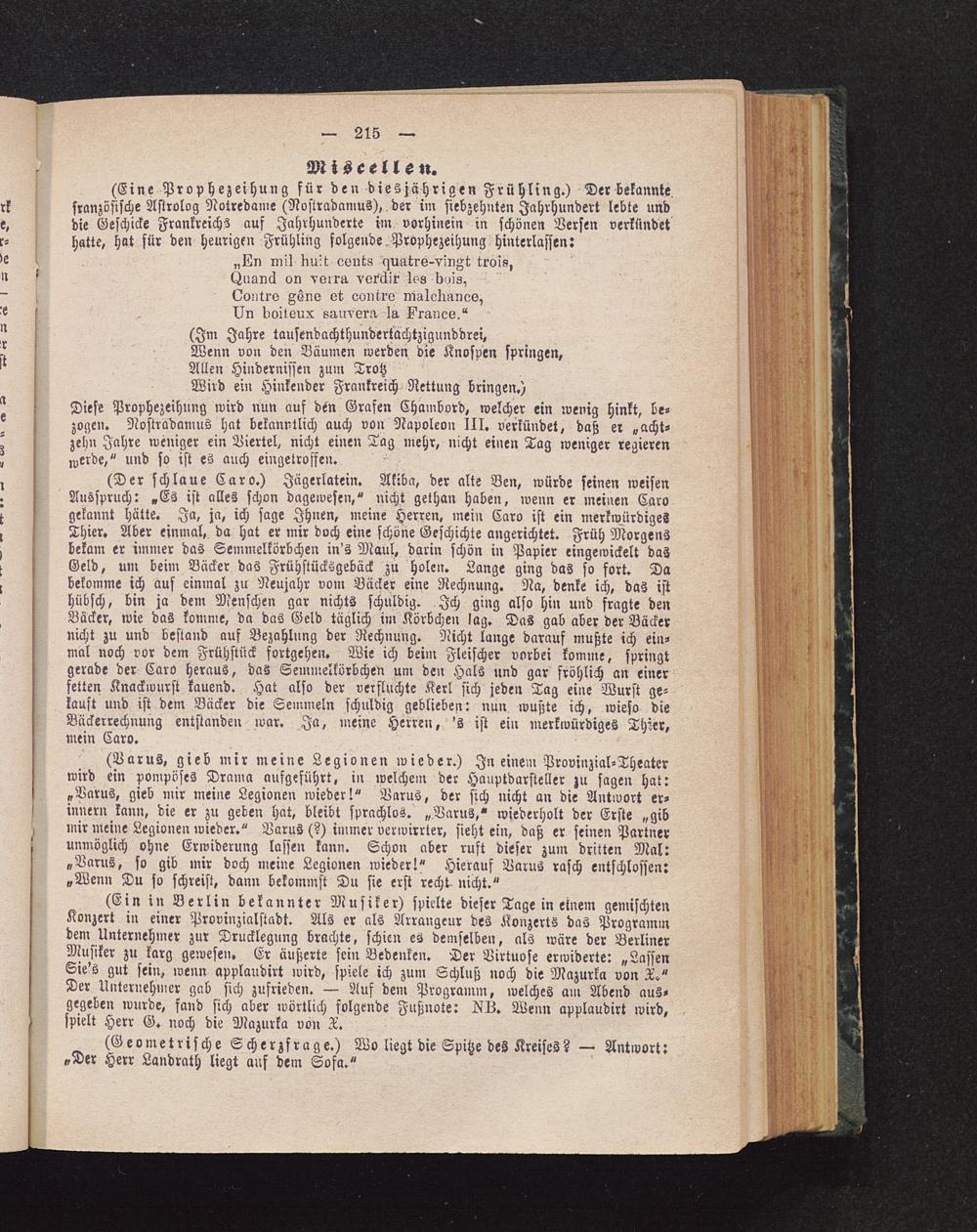 (Varus, gieb mir meine Legionen wieder.) In einem Provinzial-Theaterwird ein pompöses Drama aufgeführt, in welchem der Hauptdarsteller zu sagen hat:„Varus, gieb mir meine Legionen wieder!" Varus, der sich nicht an die Antwort er-innern kann, die er zu geben hat, bleibt sprachlos. „Varus," wiederholt der Erste „gibmir meine Legionen wieder." Varus (?) immer verwirrter, sieht ein, daß er seinen Partnerunmöglich ohne Erwiderung lassen kann. Schon aber ruft dieser zum dritten Mal:„Varus, so gib mir doch meine Legionen wieder!" Hierauf Varus rasch entschlossen:„Wenn Du so schreist, dann bekommst Du sie erst recht nicht."