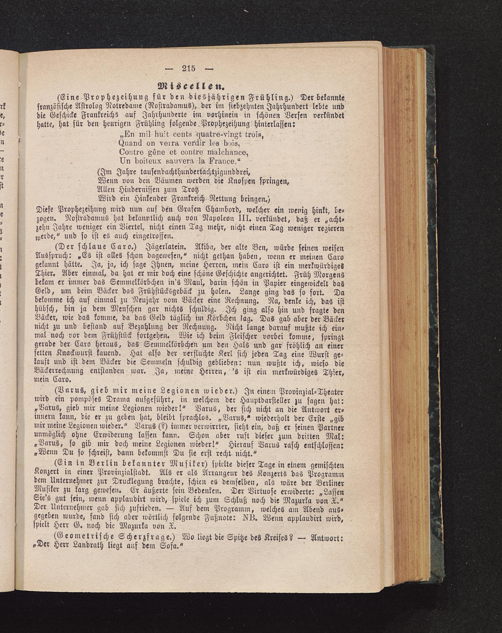 (Geometrische Scherzfrage.) Wo liegt die Spitze des Kreises? — Antwort:„Der Herr Landrath liegt auf dem Sofa."