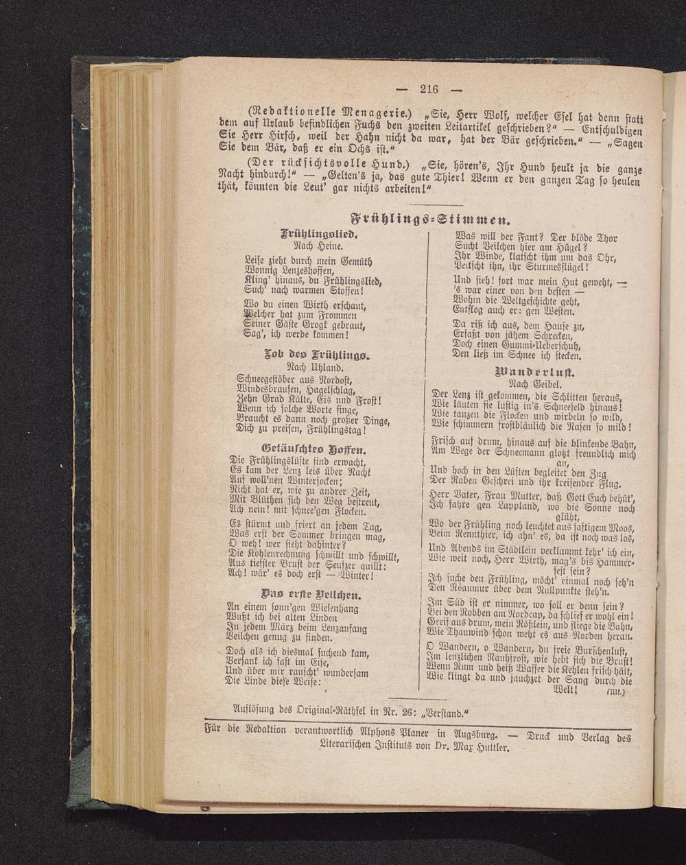(Redaktionelle Menagerie.) „Sie, Herr Wolf, welcher Esel hat denn stattdem auf Urlaub befindlichen Fuchs den zweiten Leitartikel geschrieben?" — EntschuldigenSie Herr Hirsch, weil der Hahn nicht da war, hat der Bär geschrieben." — „SagenSie dem Bär, daß er «in Ochs ist."