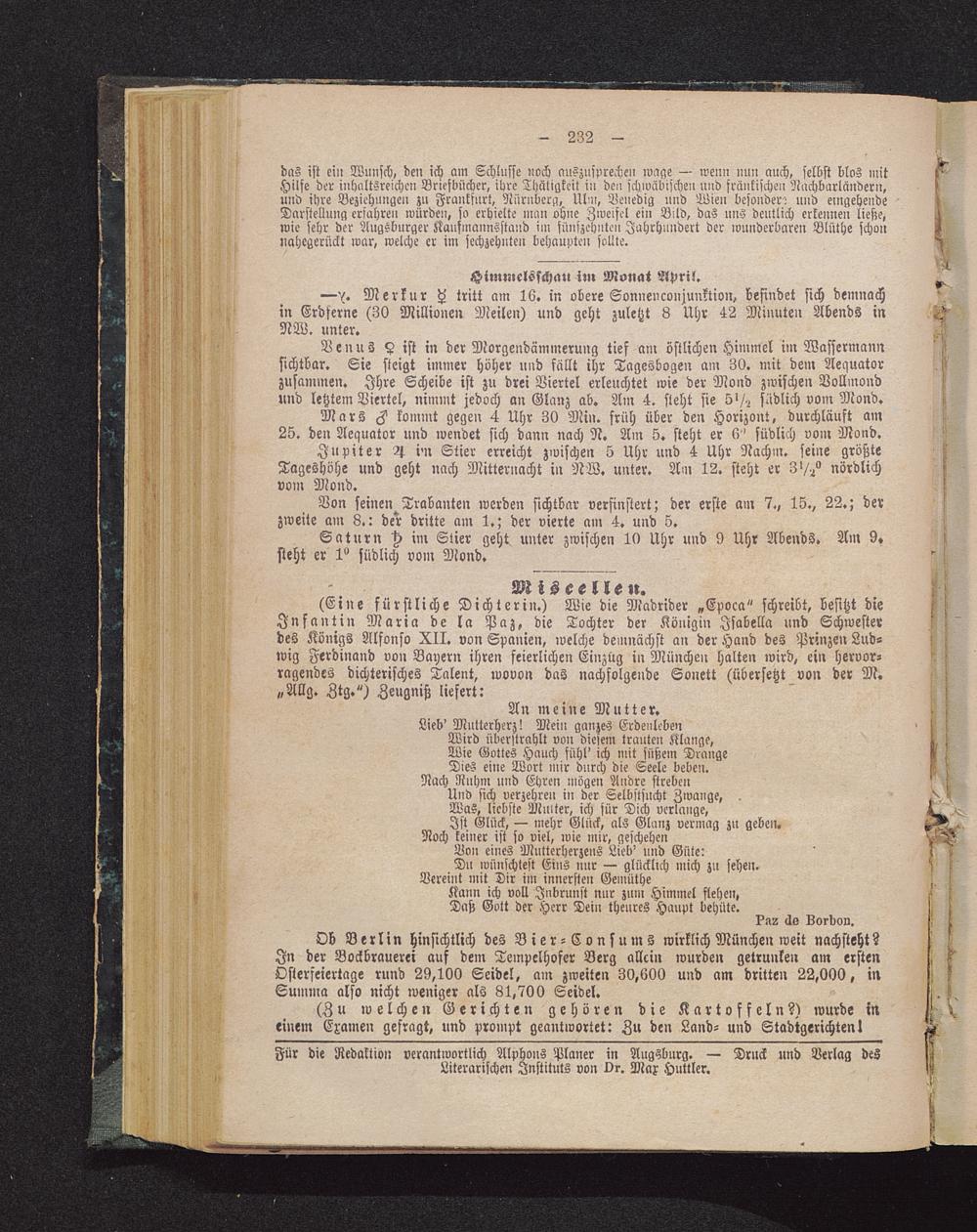 Für die Redaktion verantwortlich Alphons Planer in Augsburg . — Druck und Verlag desLiterarischen Instituts von Dr. Max Huttler.