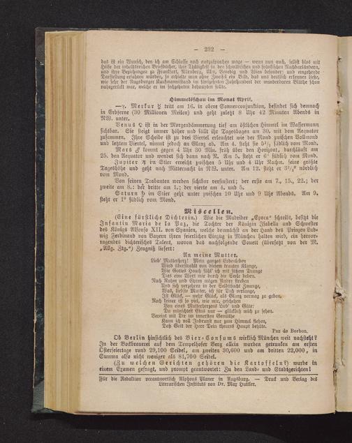 Ob Berlin hinsichtlich des Bier-Consums wirklich München weit nachsteht?In der Bockbrauerei auf dem Tempelhofer Berg allein wurden getrunken am erstenOsterfeiertage rund 29,100 Seidel, am zweiten 30,600 und am dritten 22,000, inSumma also nicht weniger als 81,700 Seidel.