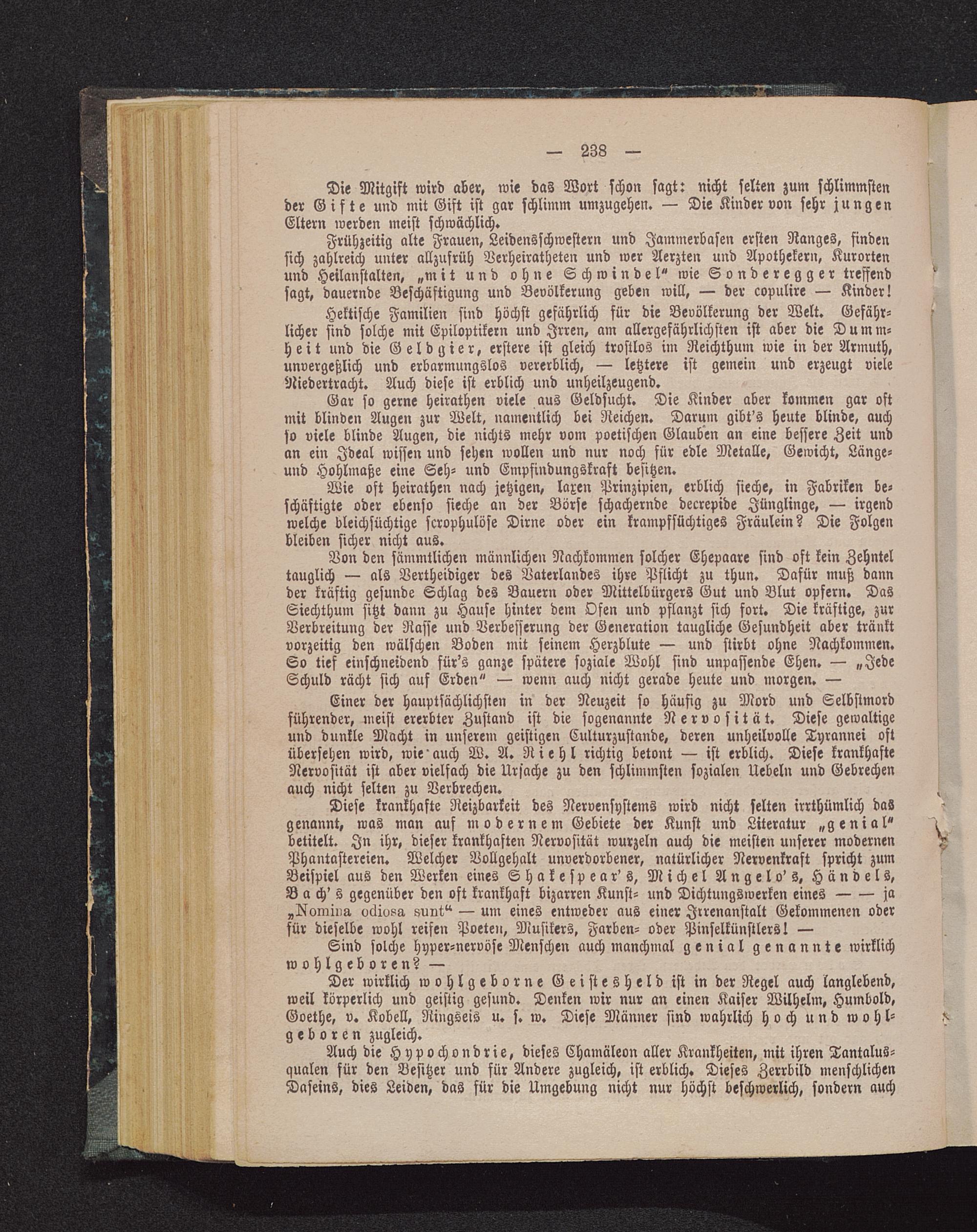 Hektische Familien sind höchst gefährlich für die Bevölkerung der Welt. Gefähr-licher sind solche mit Epileptikern und Irren, am allergefährlichsten ist aber die Dumm-heit und die Geldgier, erstere ist gleich trostlos im Reichthum wie in der Armuth,unvergeßlich und erbarmungslos vererblich, — letztere ist gemein und erzeugt vieleNiedertracht. Auch diese ist erblich und unheilzeugend.