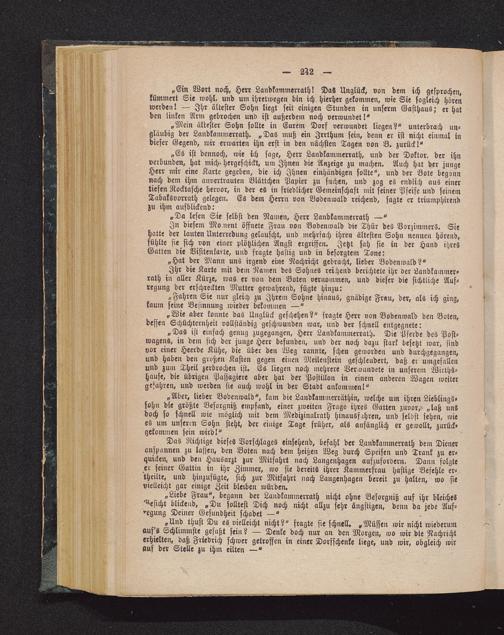 „Das ist einfach genug zugegangen, Herr Landkammerrath. Die Pferde des Post-wagens, in dem sich der junge Herr befunden, und der noch dazu stark besetzt war, sindvor einer Heerde Kühe, die über den Weg rannte, scheu geworden und durchgegangen,und haben den großen Kasten gegen einen Meilenstein geschleudert, daß er umgefallenund zum Theil zerbrochen ist. Es liegen noch mehrere Verwunvete in unserem Wirths-hause, die übrigen Passagiere aber hat der Postillon in einem anderen Wagen weitergefahren, und werden sie auch wohl in der Stadt ankommen!"