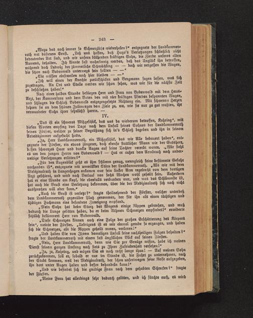 »Wozu das noch immer so Schmerzliche wiederholen?- entgegnete der Landkammer-rath mit düsterem Ernst. „Laß uns hoffen, daß Hugo's Verletzungen schließlich nichtbedeutender Art sind, und wir unsern blühenden kräftigen Sohn, die Zierde unseres altenNamens, behalten. Ich könnte fast wahnsinnig werden, daß das Unglück ihn betroffen,