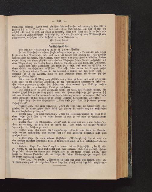 In den Schaufenstern unserer Putzhandlungen liegen garnirte Damenhiite aus, welcheso ziemlich das Monströseste sind, was man seit langer Zeit gesehen hat: BabylonischeThurmbauten aus Stroh, mit Rändern, unter denen eine ganze Familie inklusive Kinder-wagen Schutz vor einem plötzlich ausbrechenden Platzregen finden könnte, aufgetakelt miteiner Wagenladung von knallig bunten Bändern, Vogelbälgen und künstliche» Obstsorten.
