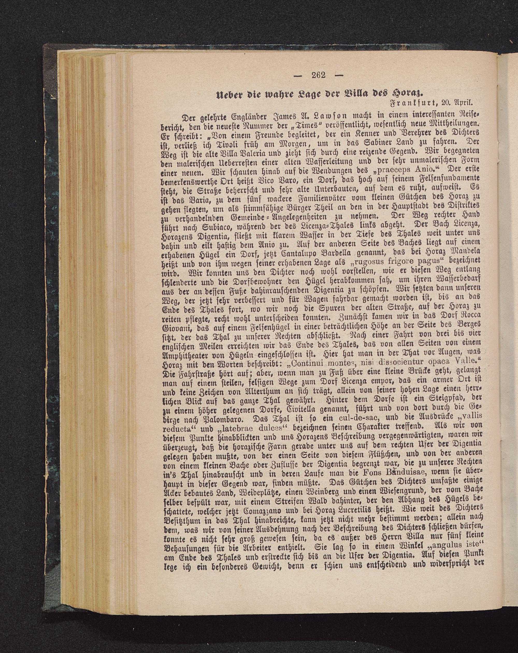 Die Fahrstraße hört auf; aber, wenn man zu Fuß über eine kleine Brücke geht, gelangtman auf einem steilen, felsigen Wege zum Dorf Licenza empor, das ein armer Ort istund keine Zeichen von Alterthum an sich trägt, allein von seiner hohen Lage einen herr-lichen Blick auf das ganze Thal gewährt. Hinter dem Dorfe ist ein Steigpfad, derzu einem höher gelegenen Dorfe, Civitella genannt, führt und von dort durch die Ge-birge nach Palombaro. Das Thal ist so ein oul-cks-ouo, und die Ausdrücke „vallisrockuvtrr" und „latebru« äulosn" bezeichnen seinen Charakter treffend. Als wir vondiesem Punkte hinabblickten und uns Horazens Beschreibung vergegenwärtigten, waren wirüberzeugt, daß die horazische Farm gerade unter uns auf dem rechten Ufer der Digentiagelegen haben mußte, von der einen Seite von diesem Flüßchen, und von der anderenvon einem kleinen Bache oder Zuflüsse der Digentia begrenzt war, die zu unserer Rechtenin's Thal hinabrauscht und in deren Laufe man die §ons Lunckuisnö, wenn sie über-haupt in dieser Gegend war, finden müßte. Das Gütchen des Dichters umfaßte einigeAcker bebautes Land, Weideplätze, einen Weinberg und einen Wiesengrund, der vom Bacheselber bespült war, mit einem Streifen Wald dahinter, der den Abhang deS Hügels be-schattete, welcher jetzt Comazzano und bei Horaz Lucretilis heißt. Wie weit des DichtersBesitzthum in das Thal hinabreichte, kann jetzt nicht mehr bestimmt werden; allein nachden,, was wir von seiner Ausdehnung nach der Beschreibung des Dichters schließen dürfen,konnte es nicht sehr groß gewesen sein, da es außer des Herrn Villa nur fünf kleineBehausungen für die Arbeiter enthielt. Sie lag so in einem Winkel „un§ulus ist,«"am Ende des Thales und erstreckte sich bis an die Ufer der Digentia. Auf diesen Punktlege ich ein besonderes Gewicht, denn er schien uns entscheidend und widerspricht der