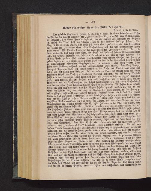 Der gelehrt« Engländer James A. Lawson macht in einem interessanten Reise«bericht, den die neueste Nummer der „Times" veröffentlicht, wesentlich neue Mittheilungen.Er schreibt: »Von einem Freunde begleitet, der ein Kenner und 'Verehrer des Dichtersist, verließ ich Tivoli früh am Morgen, um in das Sabiner Land zu fahren. DerWeg ist die alte Villa Valeria und zieht sich durch eine reizende Gegend. Wir begegnetenden malerischen Ueberresten einer alten Wasserleitung und der sehr unmalerischen Formeiner neuen. Wir schauten hinab auf die Wendungen des „praooapa ^nio.^ Der erstebemerkenswerthe Ort heißt Vico Varo, ein Dorf, das hoch auf seinem Felsenfundamentesteht, die Straße beherrscht und sehr alte Unterbauten, auf dem es ruht, ausweist. Esist das Varia, zu dem fünf wackere Familienvater vom kleinen Gütchen des Horaz zugehen siegten, um als stimmfähige Bürger Theil an den in der Hauptstadt des Distrikteszu verhandelnden Gemeinde-Angelegenheiten zu nehmen. Der Weg rechter Handführt nach Subiaco , während der des Licenza-Thales links abgeht. Der Bach Licenza,Horazens Digentia, fließt mit klarem Wasser in der Tiefe des Thales weit unter unsdahin und eilt hastig dem Anio zu. Auf der anderen Seite des Baches liegt auf einemerhabenen Hügel ein Dorf, jetzt Cantalupo Bardclla genannt, das bei Horaz Mandelaheißt und von ihm wegen seiner erhabenen Lage als „ruAoous kriZors puZus" bezeichnetwird. Wir konnten uns den Dichter noch wohl vorstellen, wie er diesen Weg entlangschlenderte und die Dorfbewohner den Hügel Herabkommen sah, um ihren Wasserbedarfaus der an dessen Fuße dahinrauschenden Digentia zu schöpfen. Wir setzten dann unsere»Weg, der jetzt sehr verbessert und für Wagen fahrbar gemacht worden ist, bis an dasEnde des Thales fort, wo wir noch die Spuren der alten Straße, auf der Horaz zureiten pflegte, recht wohl unterscheiden konnten. Zunächst kamen wir in das Dorf RoccaGiovani, das auf einem Felsenhügel in einer beträchtlichen Höhe an der Seite des Bergessitzt, der das Thal zu unserer Rechten abschließt. Nach einer Fahrt von drei bis vierenglischen Meilen erreichten wir das Ende des Thales, das von allen Seiten von einemAmphitheater von Hügeln eingeschlossen ist. Hier hat man in der That vor Augen, wasHoraz mit den Worten beschreibt: „Lontinui nisi äisrooieiitur opuou Vnl's."