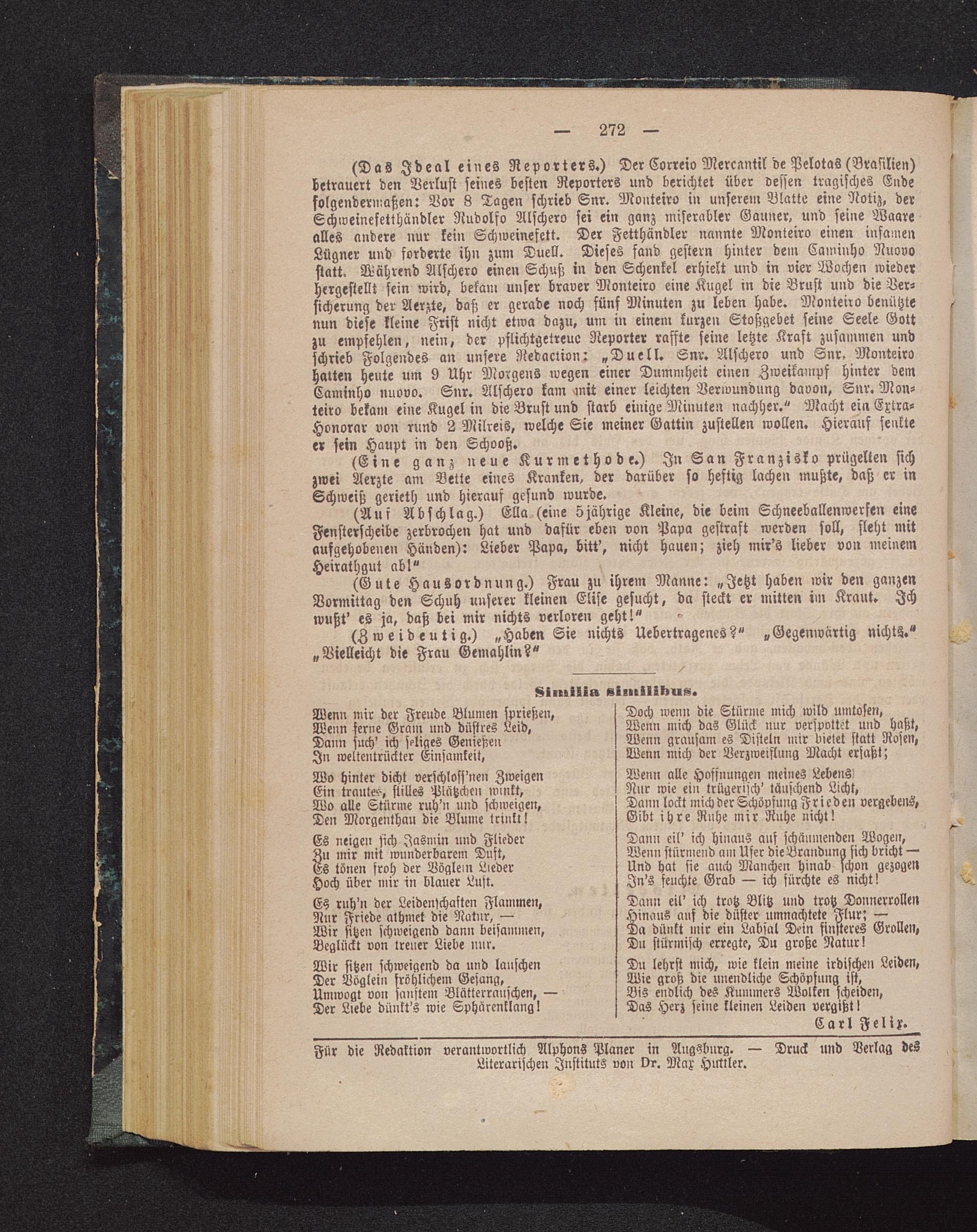 (Das Ideal eines Reporters.) Der Correio Mercantil de Pelotas (Brasilien )betrauert den Verlust seines besten Reporters und berichtet über dessen tragisches Endefolgendermaßen: Vor 8 Tagen schrieb Snr. Monteiro in unseren: Blatte eine Notiz, derEchweinefetthändler Nudolfo Alschero sei ein ganz miserabler Gauner, und seine Waarealles andere nur kein Schweinefett. Der Fetthändler nannte Monteiro einen infamenLügner und forderte ihn zum Duell. Dieses fand gestern hinter dem Caminho Nuovostatt. Während Alschero einen Schuß in den Schenkel erhielt und in vier Wochen wiederhergestellt sein wird, bekam unser braver Monteiro eine Kugel in die Brust und die Ver-sicherung der Aerzte, daß er gerade noch fünf Minuten zu leben habe. Monteiro benutztenun diese kleine Frist nicht etwa dazu, um in einem kurzen Stoßgebet seine Seele Gott zu empfehlen, nein, der pflichtgetreue Reporter raffte seine letzte Kraft zusammen undschrieb Folgendes an unsere Redaction: „Duell. Snr. Alschero und Snr, Monteirohatten heute um 9 Uhr Morgens wegen einer Dummheit einen Zweikampf hinter demCaminho nuovo. Snr. Alschero kam mit einer leichten Verwundung davon, Snr. Mon-teiro bekam eine Kugel in die Brust und starb einige Minuten nachher." Macht ein Extra-Honorar von rund 2 Mrlreis, welche Sie meiner Gattin zustellen wollen. Hierauf senkteer sein Haupt in den Schooß.