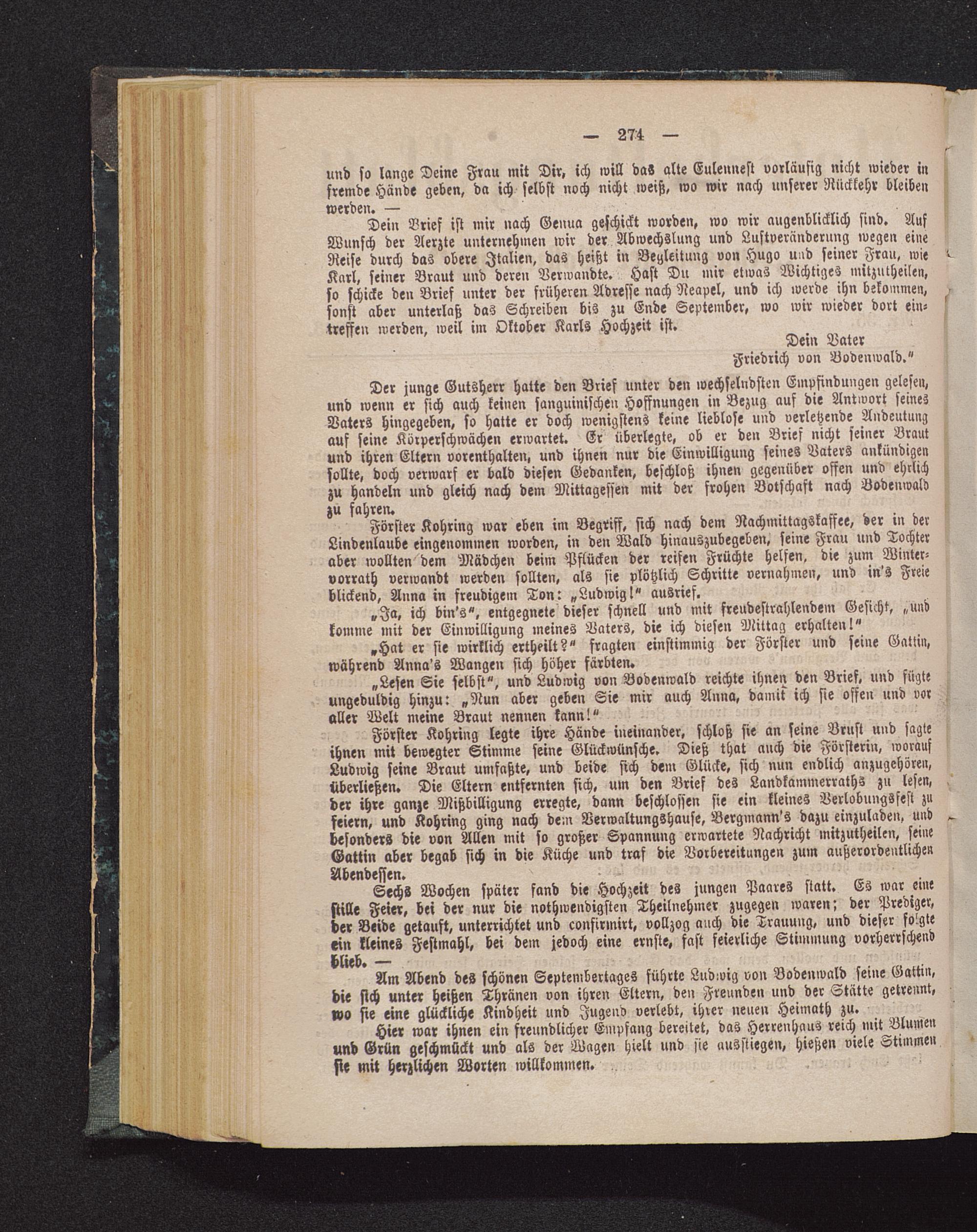 Am Abend des schönen Septembertages führte Ludwig von Bodenwald seine Gattin,die sich unter heißen Thränen von ihren Eltern, den Freunden und der Stätte getrennt,wo sie eine glückliche Kindheit und Jugend verlebt, ihrer neuen Heimath zu.