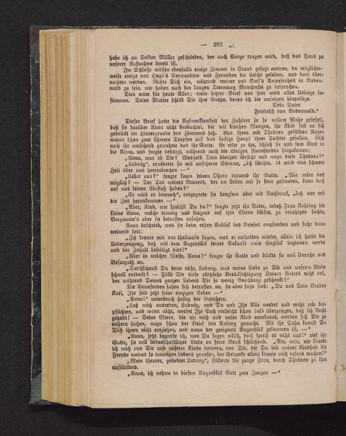 „Anna, jetzt begreife ich, was Du sagen willst, doch sprich es nicht aus!" rief ihrGatte, sie voll leidenschaftlicher Liebe an seine Brust schließend. „Nie, nein, nie könnteich mich von Dir und unserm Kinde trennen, von Dir, die Du seit meiner Kindheit dieFreude meines so traurigen Lebens gewesen, der Gedanke allein könnte mich rasend machen!"