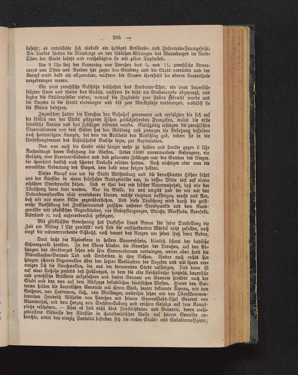 Dort lacht die Nheinebene in Hellem Sonnenschein, bläulich schaut der badischeSchwarzwald herüber. In der Ebene blinken die Gewehre der Preußen , auf den Ab-hängen des Geisberges sehen wir ihre Sturmcolonnen vordringen, weiter oben speit dieMitrailleusen-Batterie Tod und Verderben in ihre Reihen. Weiter nach rechts hinhängen schwere Regenwolken über den letzten Ausläufern der Vogesen und mit ihnen ver-einigen sich die Rauchwolken, die aus der brennenden Stadt aufsteigen. Und dann istauf einer Anhöhe jenseits des Hohlweges, in dem die alte Neichsstraße hinzieht, bayerischeund preußische Artillerie aufgefahren und sendet Granate um Granate hinüber nach derStadt und den nun auf dem Rückzüge befindlichen feindlichen Massen. Hinter den Bat-terien halten die bayerischen Generale mit ihrem Stab, lauter bekannte Namen, wie vonBothmer, von Hartmann, Lutz, von Maillinger, weiterhin sehen wir den Oberstkomman-dnenden Friedrich Wilhelm von Preußen mit seinem Generalstabs-Chef General von -Blumenthal, mit dem Herzog von Sachsen-Coburg und reichem Gefolge auf dem Kampf-platze erscheinen. — Aber es sind nicht blos Fürstlichkeiten und Generale, deren wohl-getroffene Bildnisse der Künstler in charakteristischer Weise auf seinem Gemälde an-brachte, unter den vierzig Porträts befinden sich die vielen Stabs- und Subalternofsiziere;