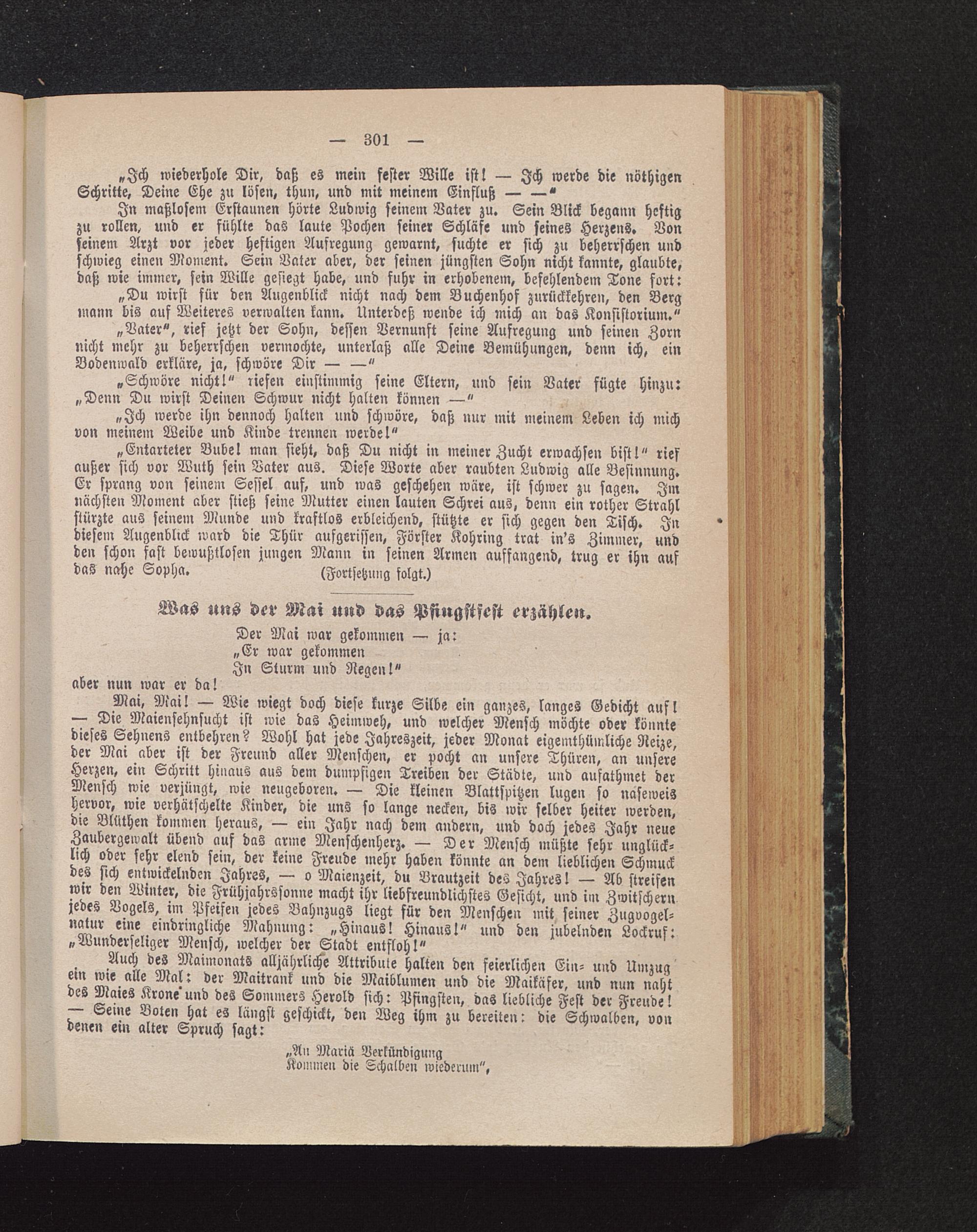 Auch des MaimonatS alljährliche Attribute halte» den feierlichen Ein- und Umzugein wie alle Mal: der Maitrank und die Maiblumen und die Maikäfer, und nun nahtdes Maies Krone'und des Sommers Herold sich: Pfingsten, das liebliche Fest der Freuds!