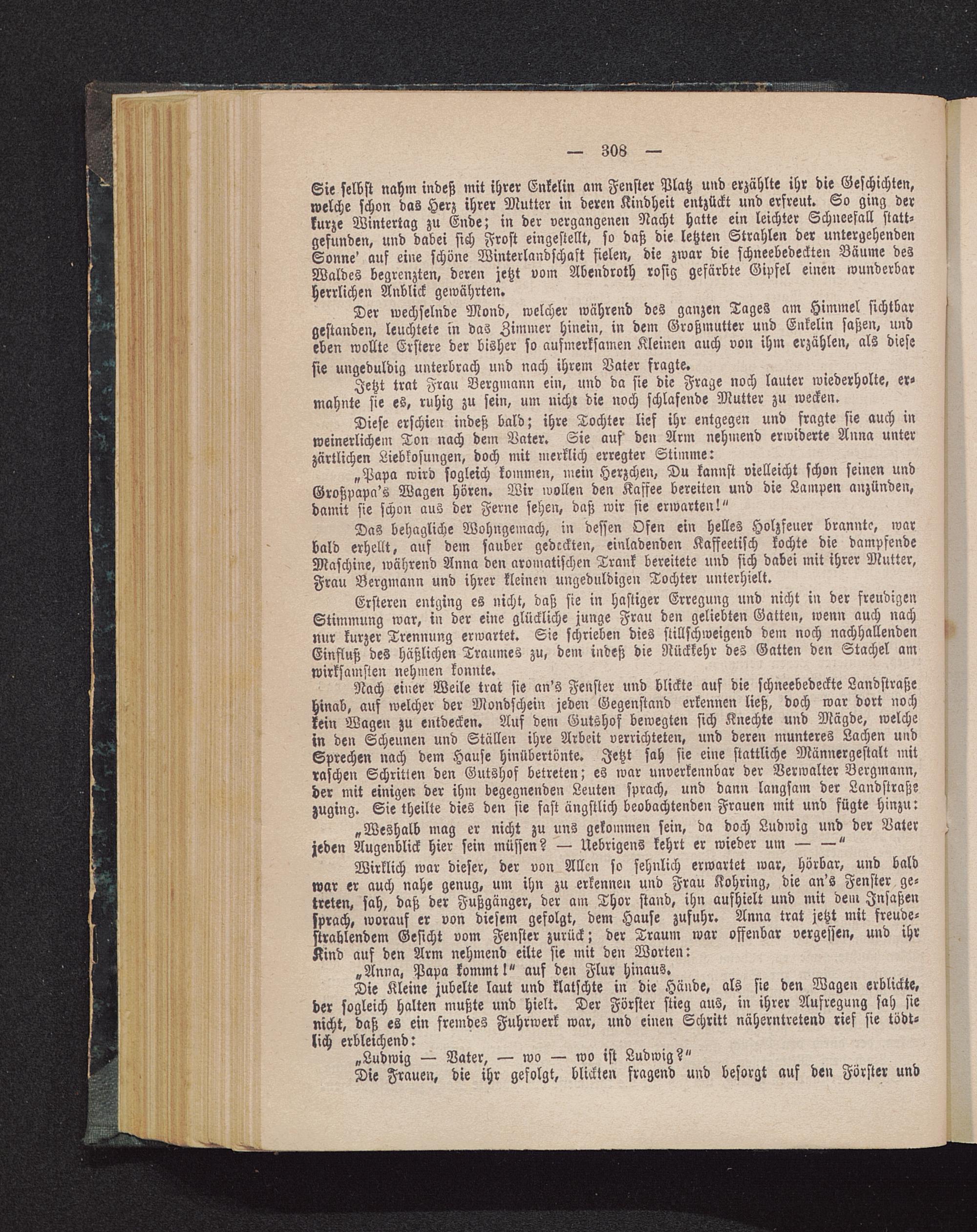 Sie selbst nahm indeß mit ihrer Enkelin am Fenster Platz und erzählte ihr die Geschichten,welche schon das Herz ihrer Mutter in deren Kindheit entzückt und erfreut. So ging derkurze Wintertag zu Ende; in der vergangenen Nacht hatte ein leichter Schneefall statt-gefunden, und dabei sich Frost eingestellt, so daß die letzten Strahlen der untergehendenSonne' auf eine schöne Winterlandschaft fielen, die zwar die schneebedeckten Bäume desWaldes begrenzten, deren jetzt vom Abendroth rosig gefärbte Gipfel einen wunderbarherrlichen Anblick gewährten.