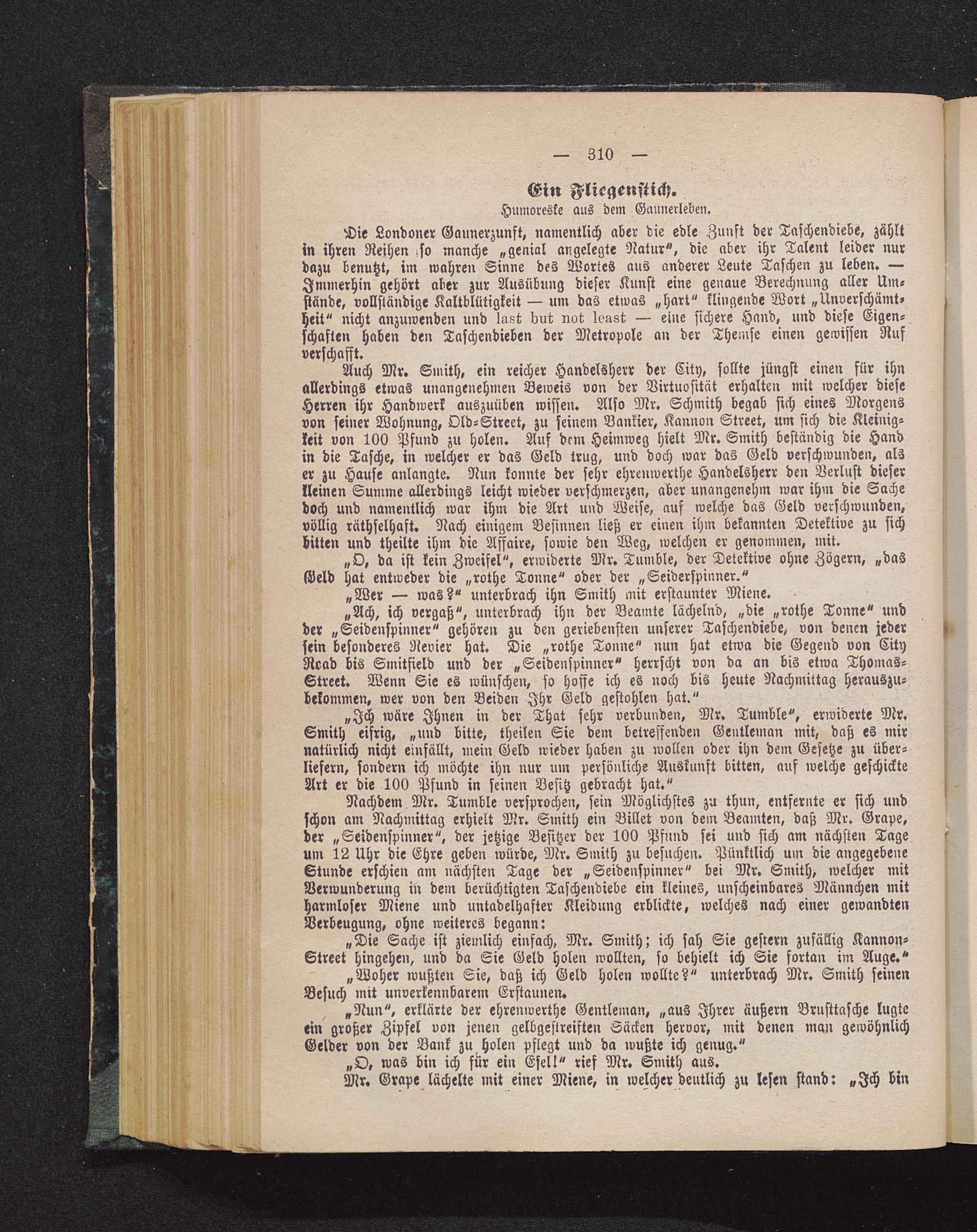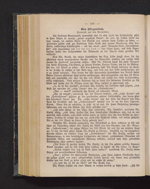 Nachdem Mr. Tumble versprochen, sein Möglichstes zu thun, entfernte er sich undschon am Nachmittag erhielt Mr. Smith ein Billet von dem Beamten, daß Mr. Grape,der „Seidenspinner", der jetzige Besitzer der 100 Pfund sei und sich am nächsten Tageum 12 Uhr die Ehre geben würde, Mr. Smith zu besuchen. Pünktlich um die angegebeneStunde erschien am nächsten Tage der „Seidenspinner" bei Mr. Smith, welcher mitVerwunderung in dem berüchtigten Taschendiebe ein kleines, unscheinbares Männchen mitharmloser Miene und untadelhafter Kleidung erblickte, welches nach einer gewandtenVerbeugung, ohne weiteres begann: