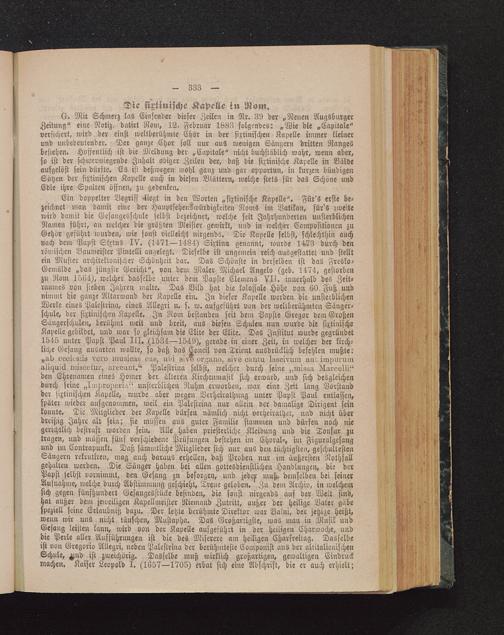 Mit Schmerz las Einsender dieser Zeilen in Nr. 39 der „Neuen Augsburg«Zeitung" eine Notiz, datirt Nom, 12. Februar 1883 folgendes: „Wie die „Capitale "versichert, wird der einst weltberühmte Chor in der sixtinischen Kapelle immer kleinerund unbedeutender. Der ganze Chor soll nur aus wenigen Sängern dritten Rangesbestehen. Hoffentlich ist die Meldung der „Capitale " nicht buchstäblich wahr, wenn aber,so ist der schwerwiegende Inhalt obiger Zeilen der, daß die sixtinische Kapelle in Bäldeaufgelöst sein dürfte. Es ist deßwegen wohl ganz und gar opportun, in kurzen bündigenSätzen der sixtinischen Kapelle auch in diesen Blättern, welche stets für das Schöne undEdle ihre Spalten öffnen, zu gedenken.